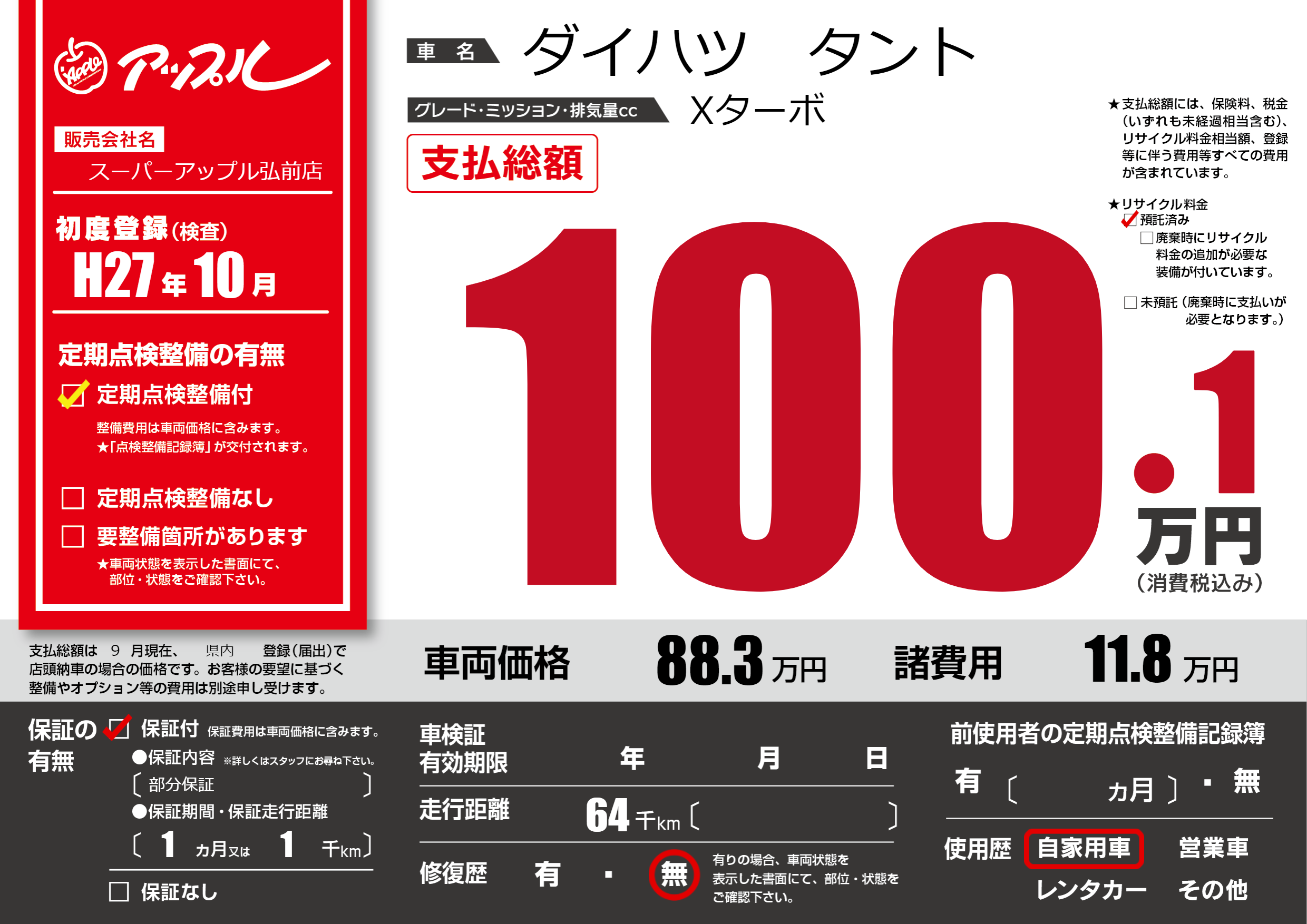 | 車名 | ダイハツ タント | グレード ミッション 排気量 |