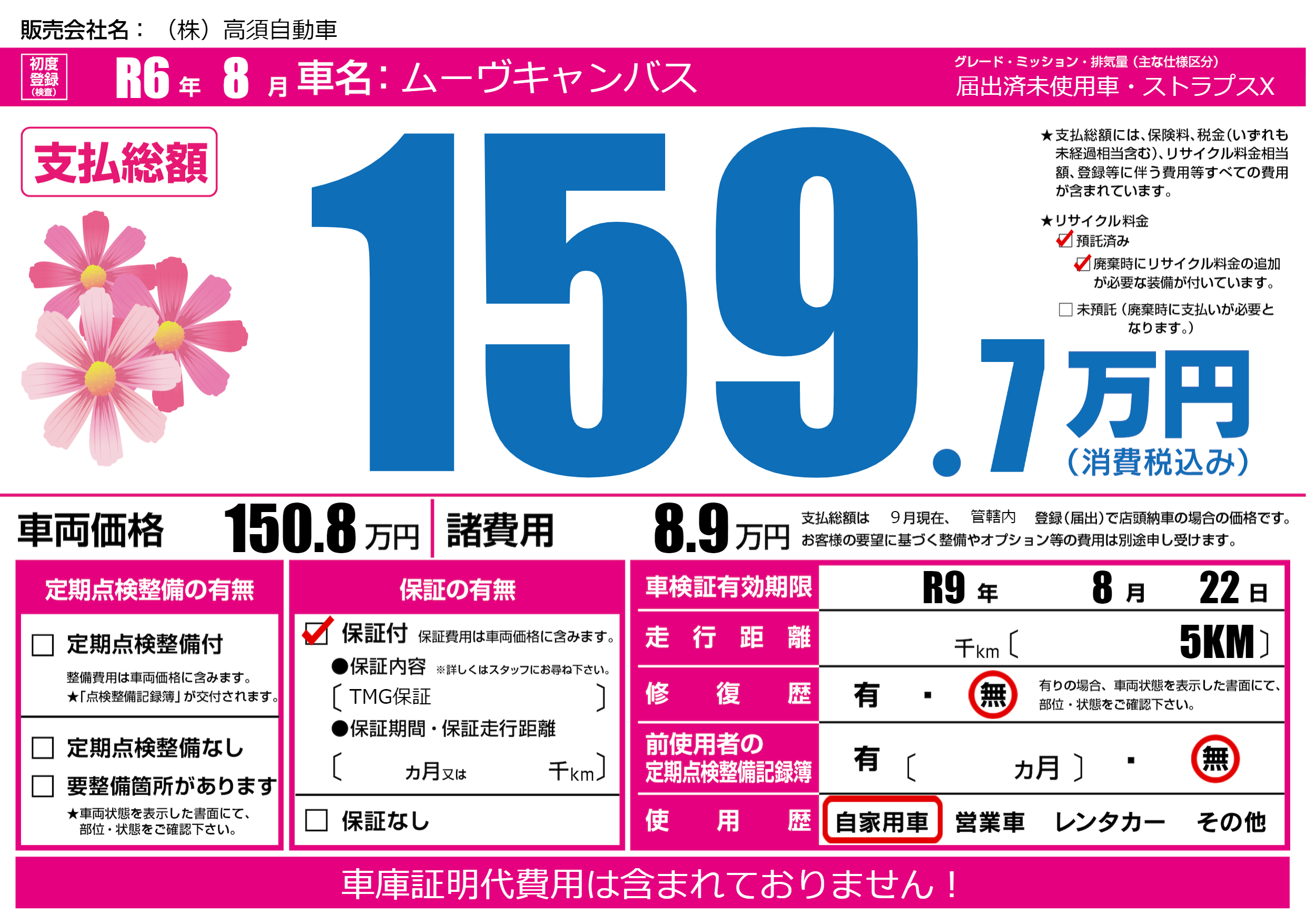 | 走行キロ | - | 初年度登録 | R6年8月 |