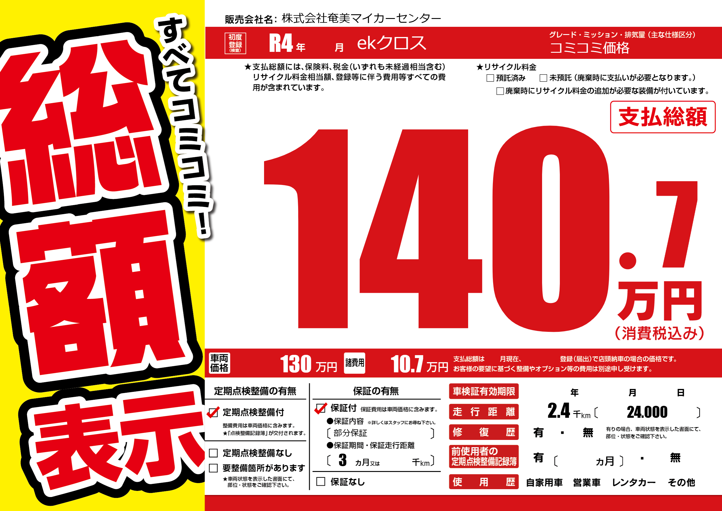 | 走行キロ | 0.2万km | 初年度登録 | R4年---月 |
