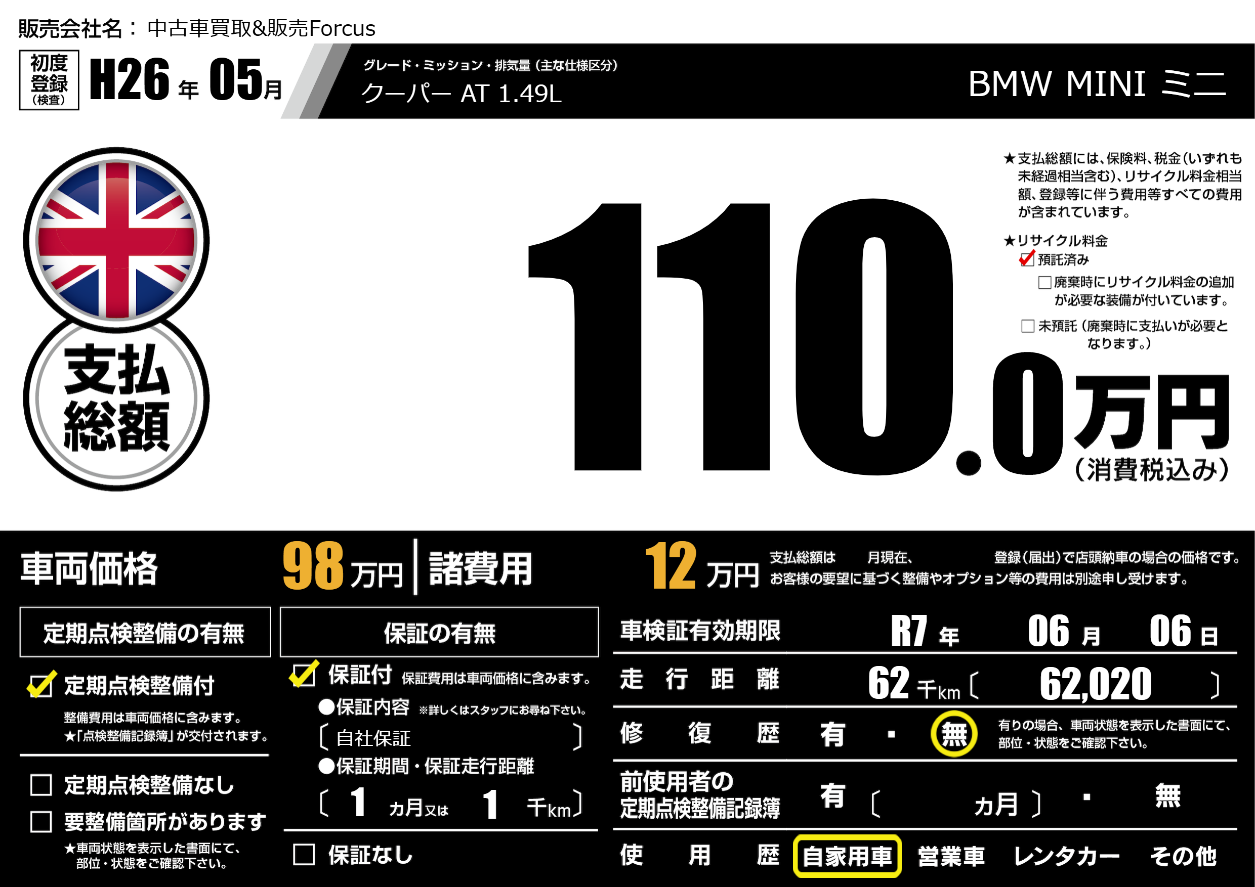 | 車名 | BMW MINI ミニ | グレード ミッション 排気量 |