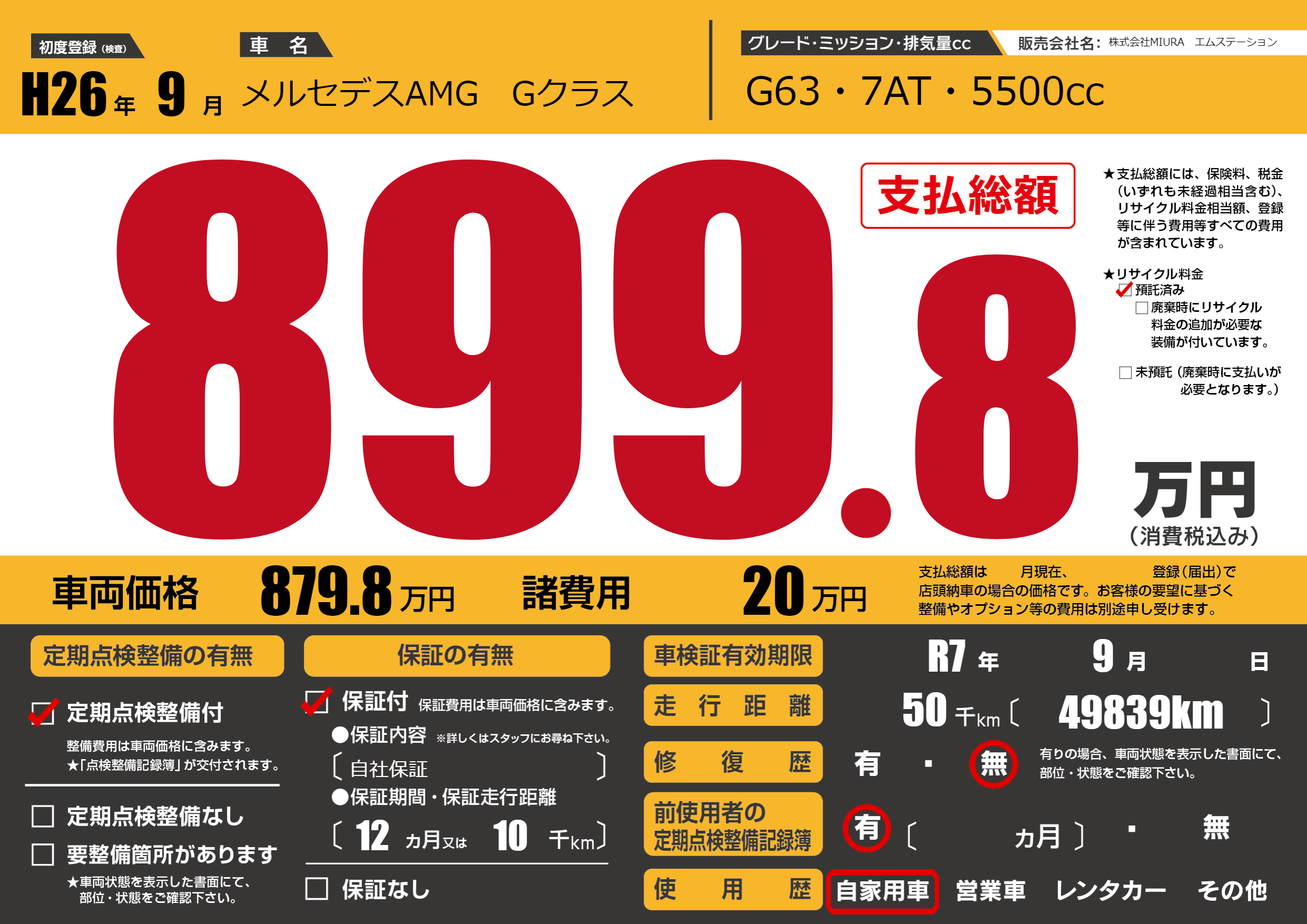 | 車名 | メルセデスAMG Gクラス | グレード ミッション 排気量 |