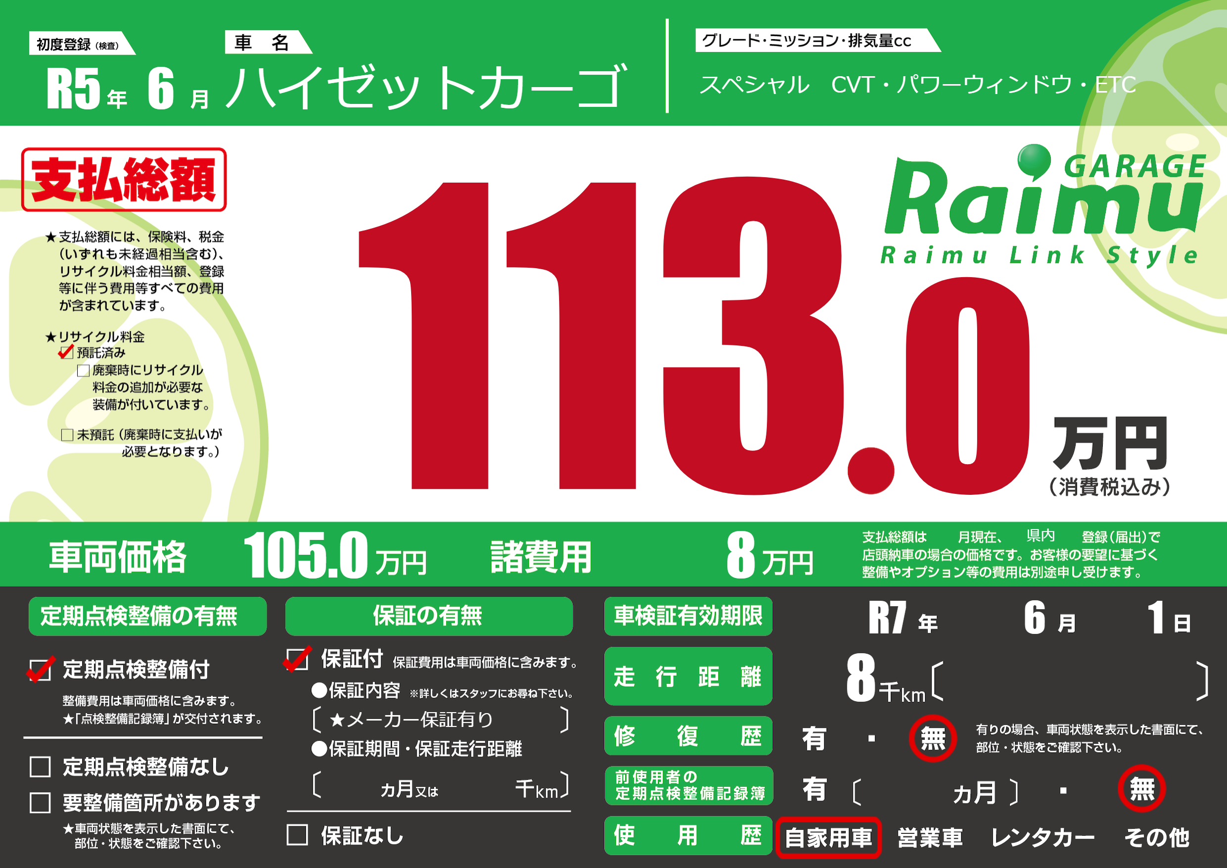 | 車名 | ハイゼットカーゴ | グレード ミッション 排気量 |