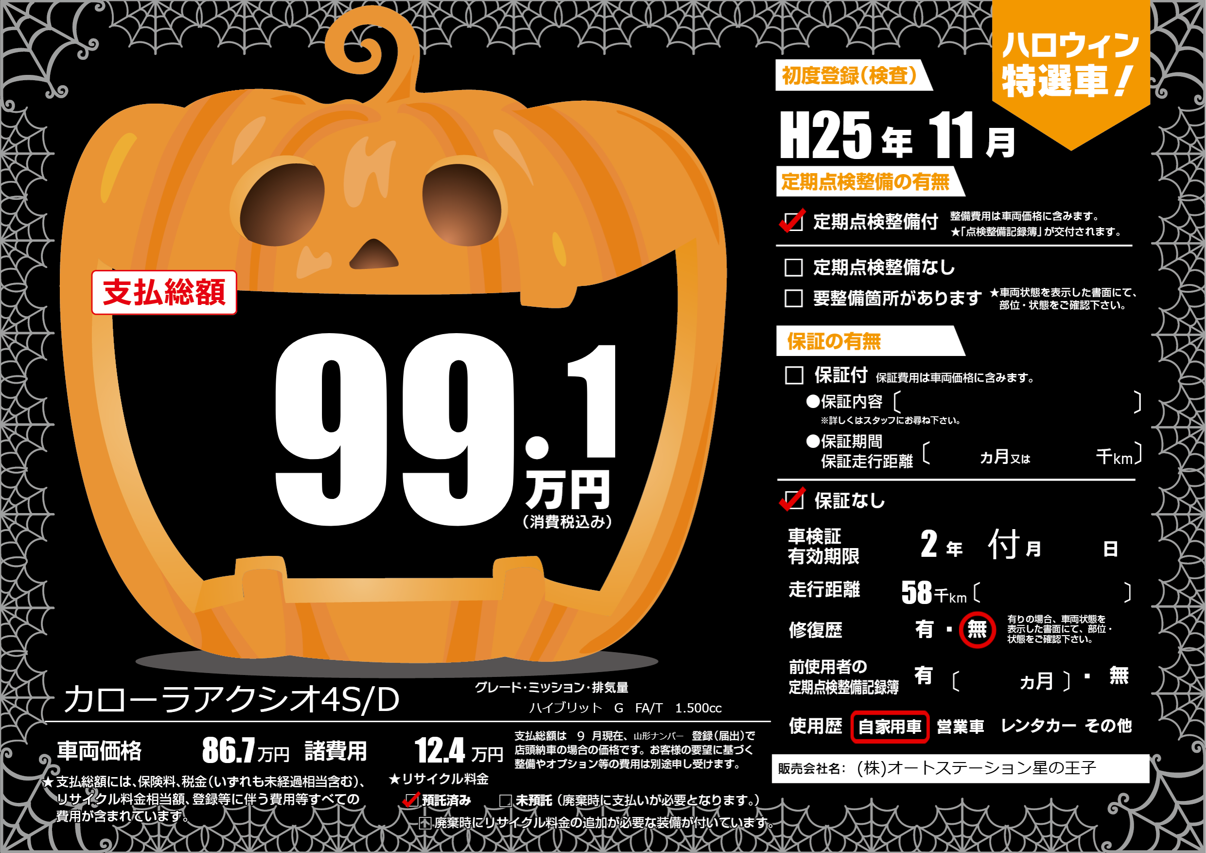 | 車名 | カローラアクシオ4S/D | グレード ミッション 排気量 |