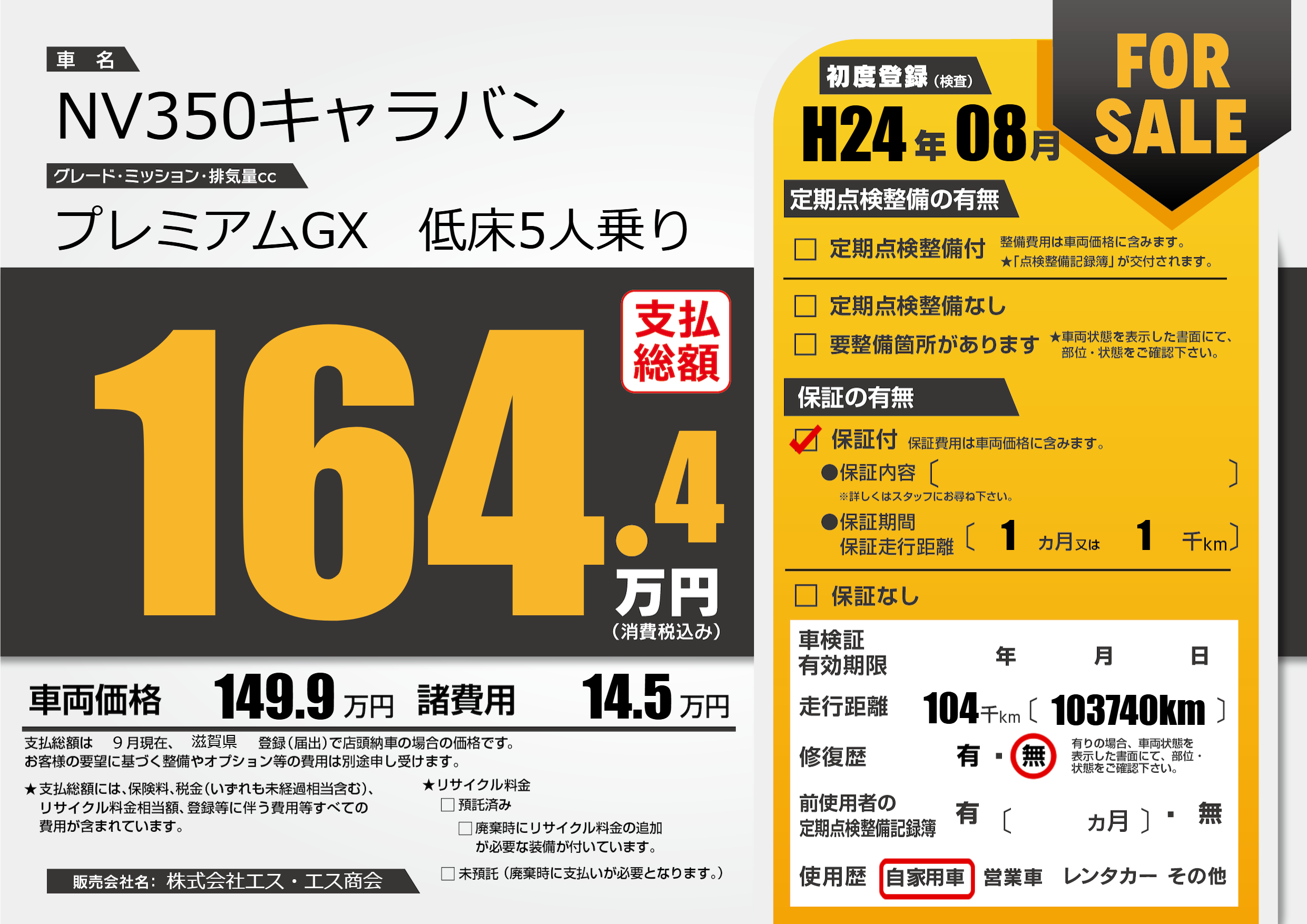 | 車名 | NV350キャラバン | グレード ミッション 排気量 |