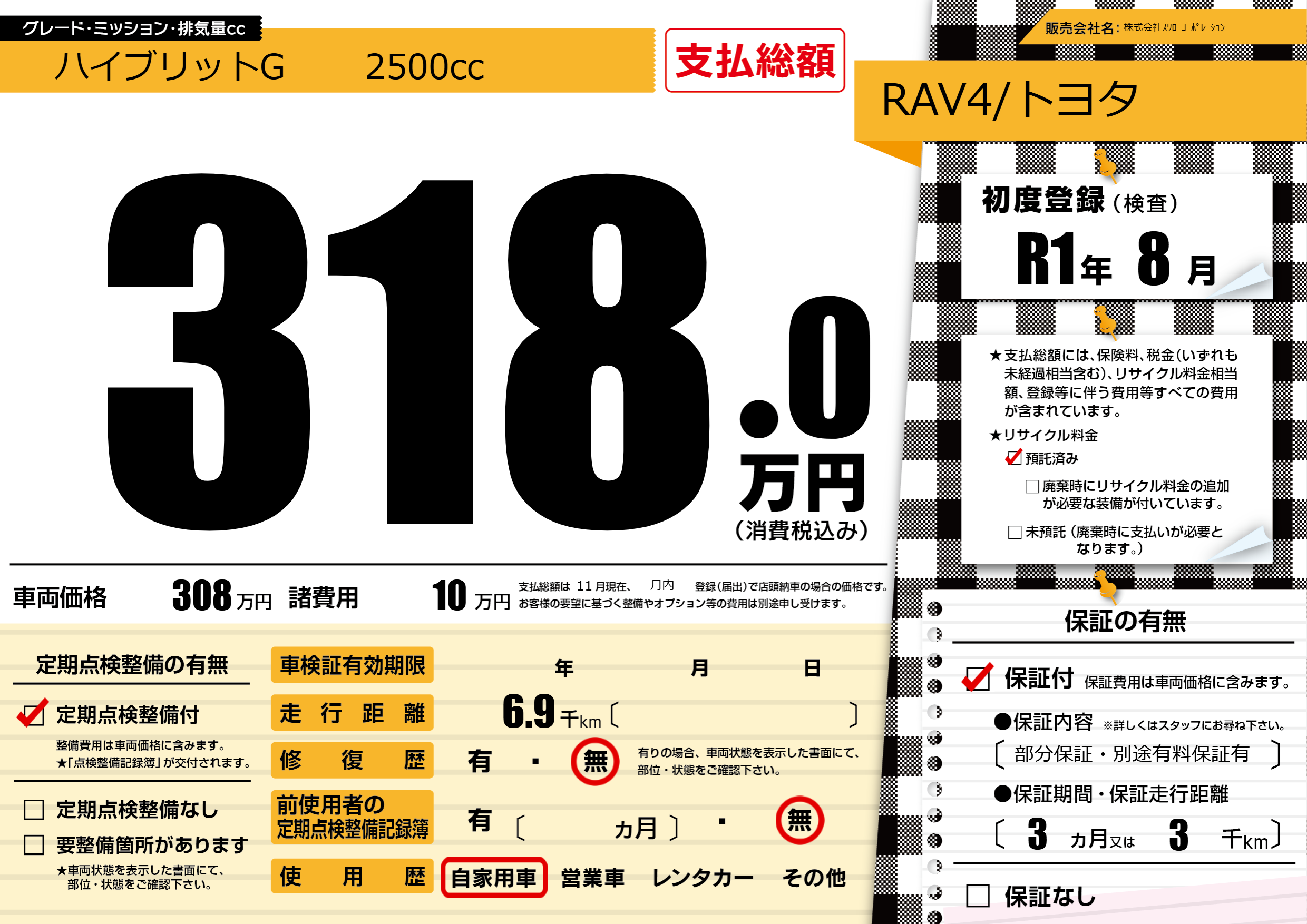 | 車名 | RAV4/トヨタ | グレード ミッション 排気量 |