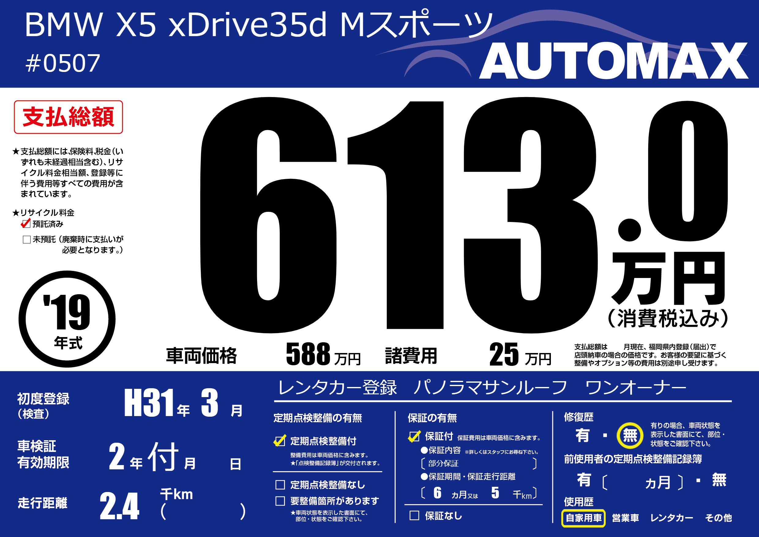 | 車名 | BMW X5 xDrive35d Mスポーツ | グレード ミッション 排気量 |