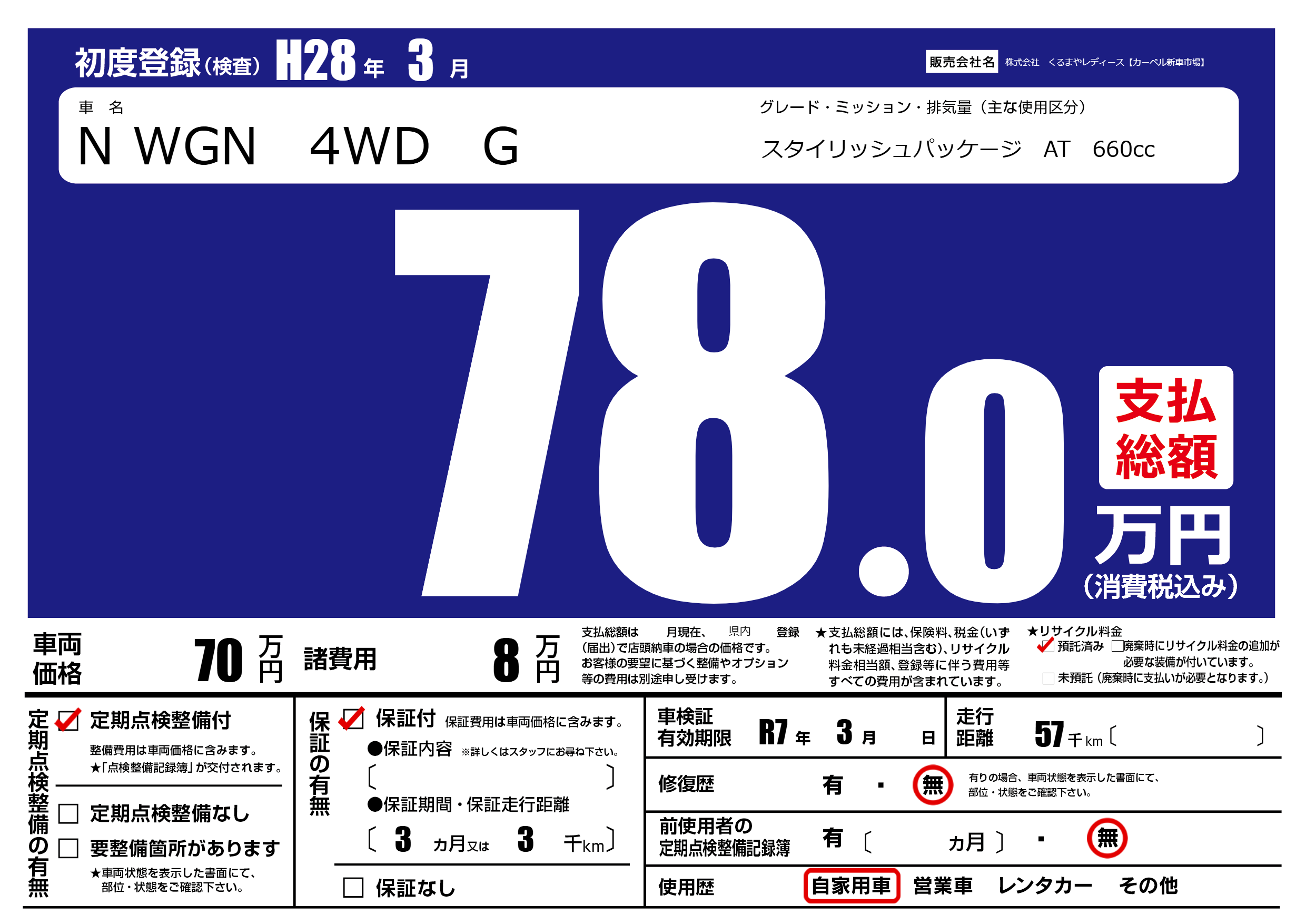 | 車名 | N WGN 4WD G | グレード ミッション 排気量 |