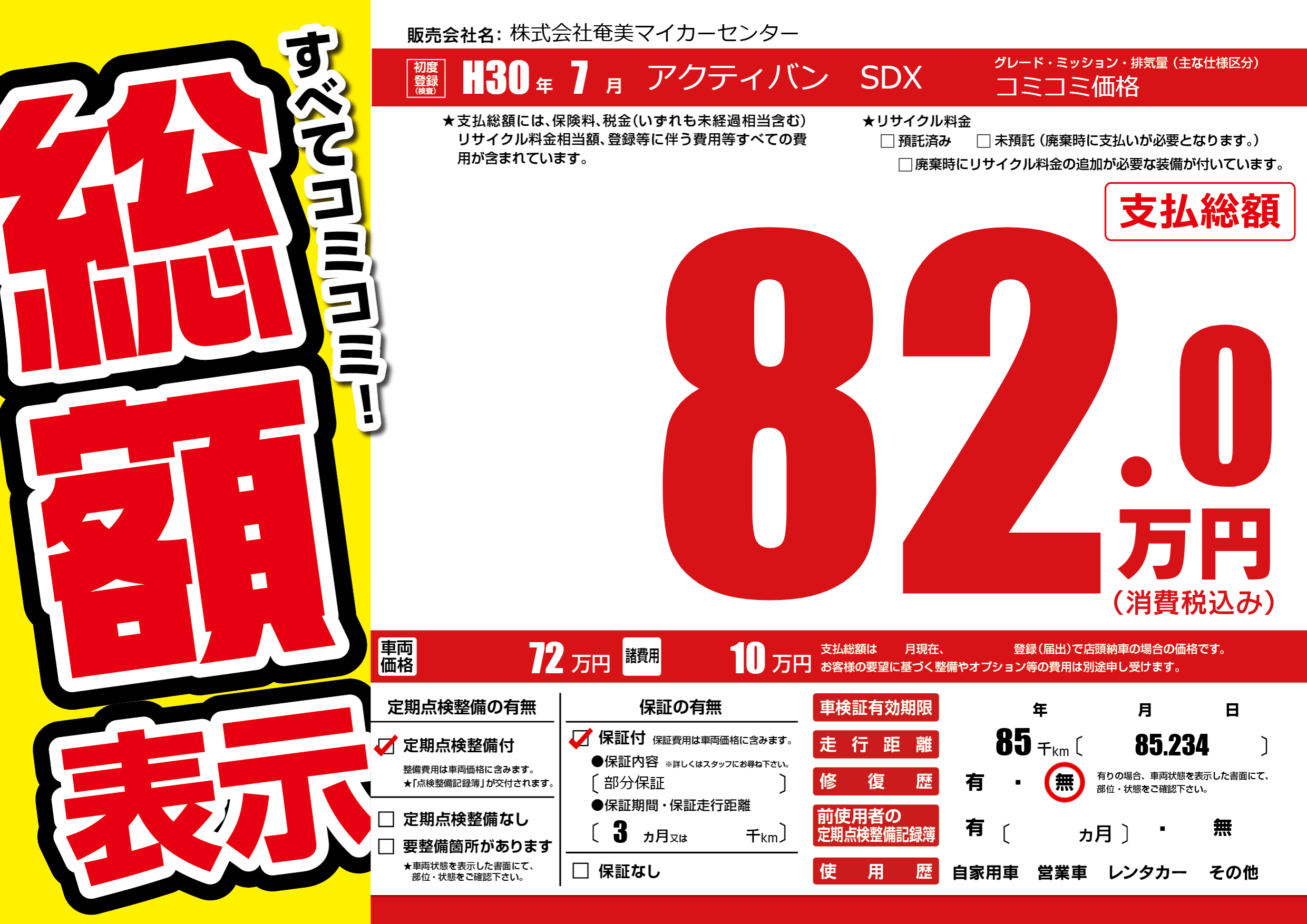 | 車名 | アクティバン SDX | グレード ミッション 排気量 |