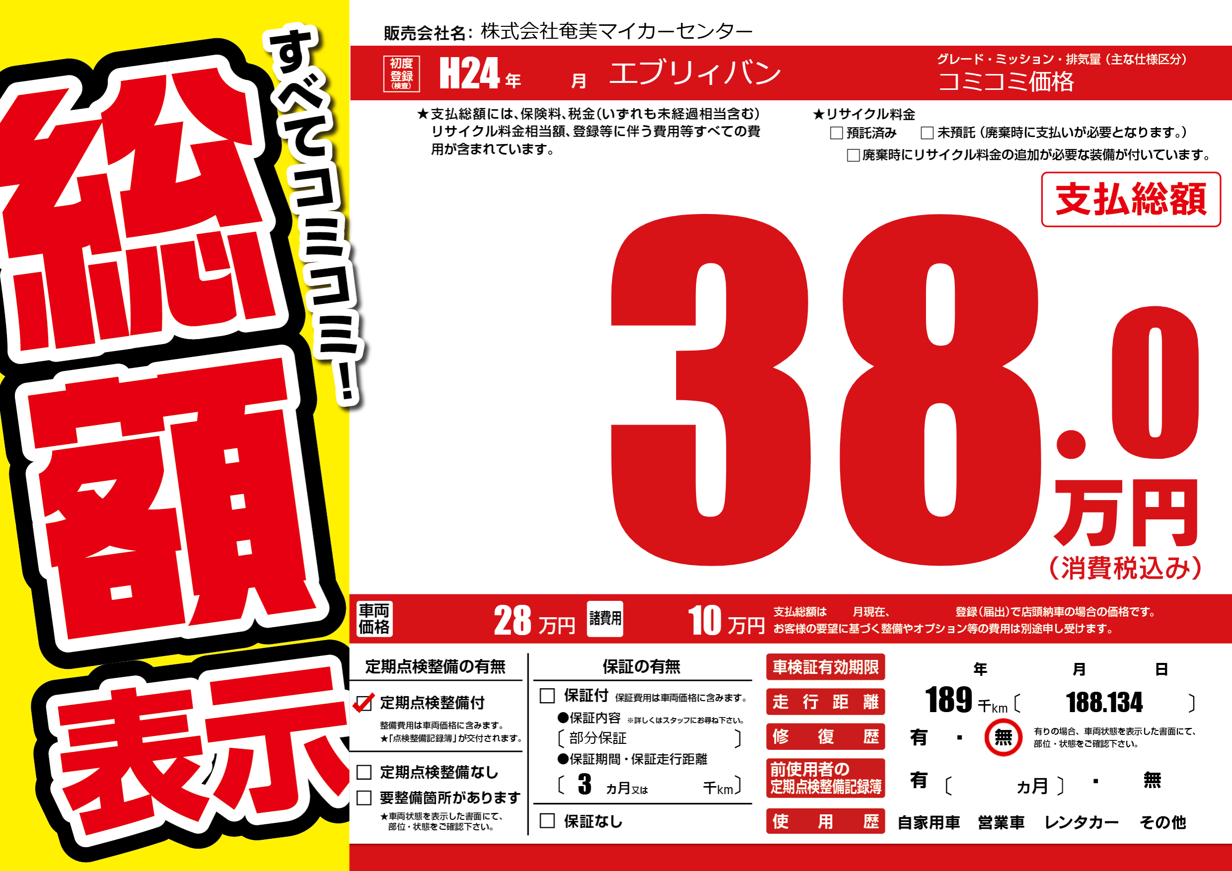| 車名 | エブリィバン | グレード ミッション 排気量 |