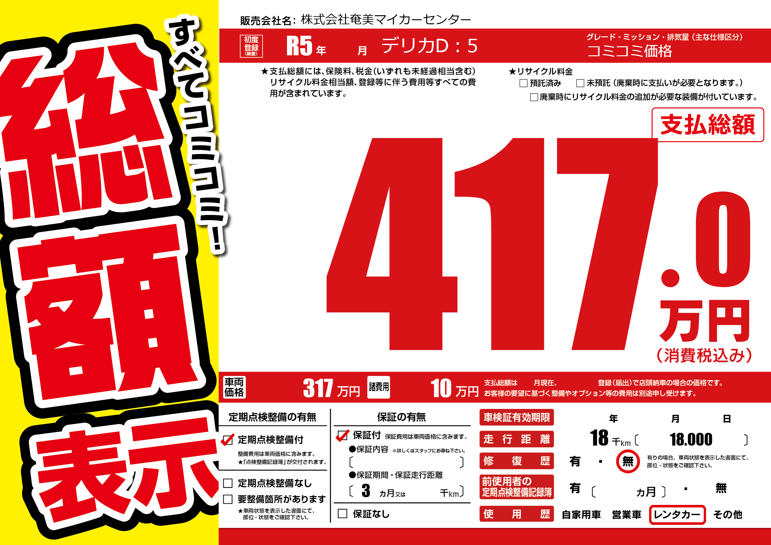 | 走行キロ | 1.8万km | 初年度登録 | R5年---月 |