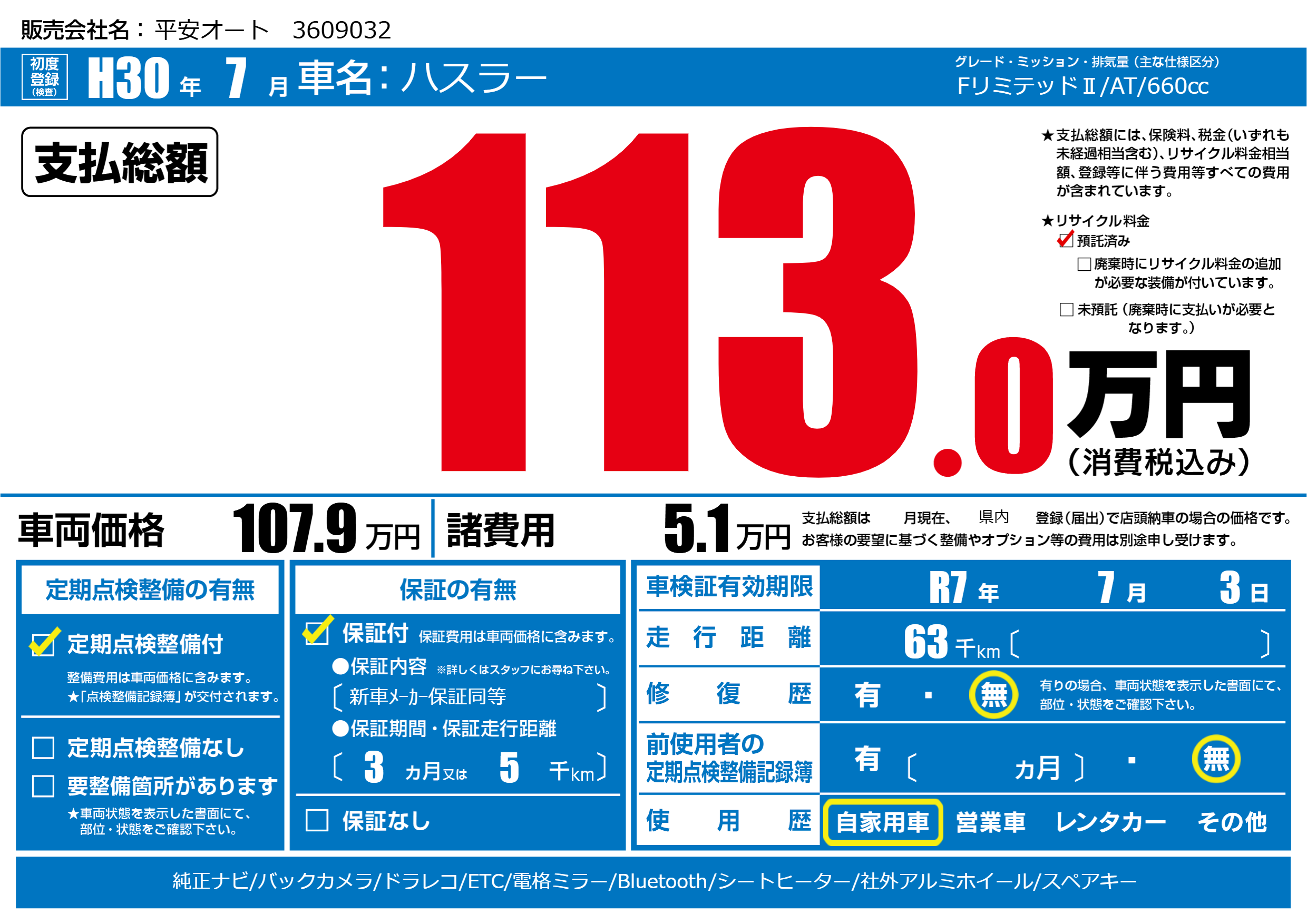 なし | 車検制限 | R7年7月3月 |