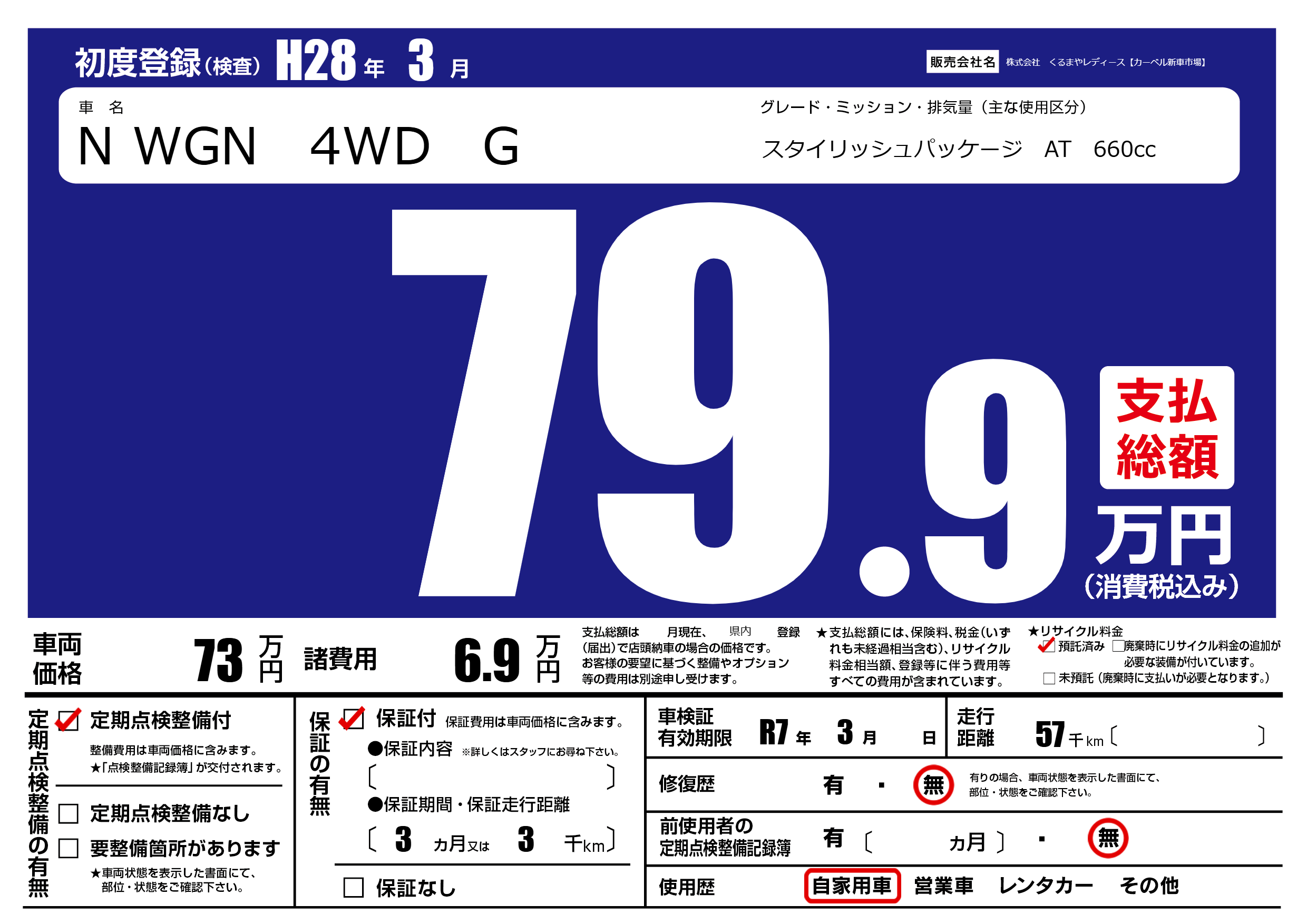 | 車名 | N WGN 4WD G | グレード ミッション 排気量 |