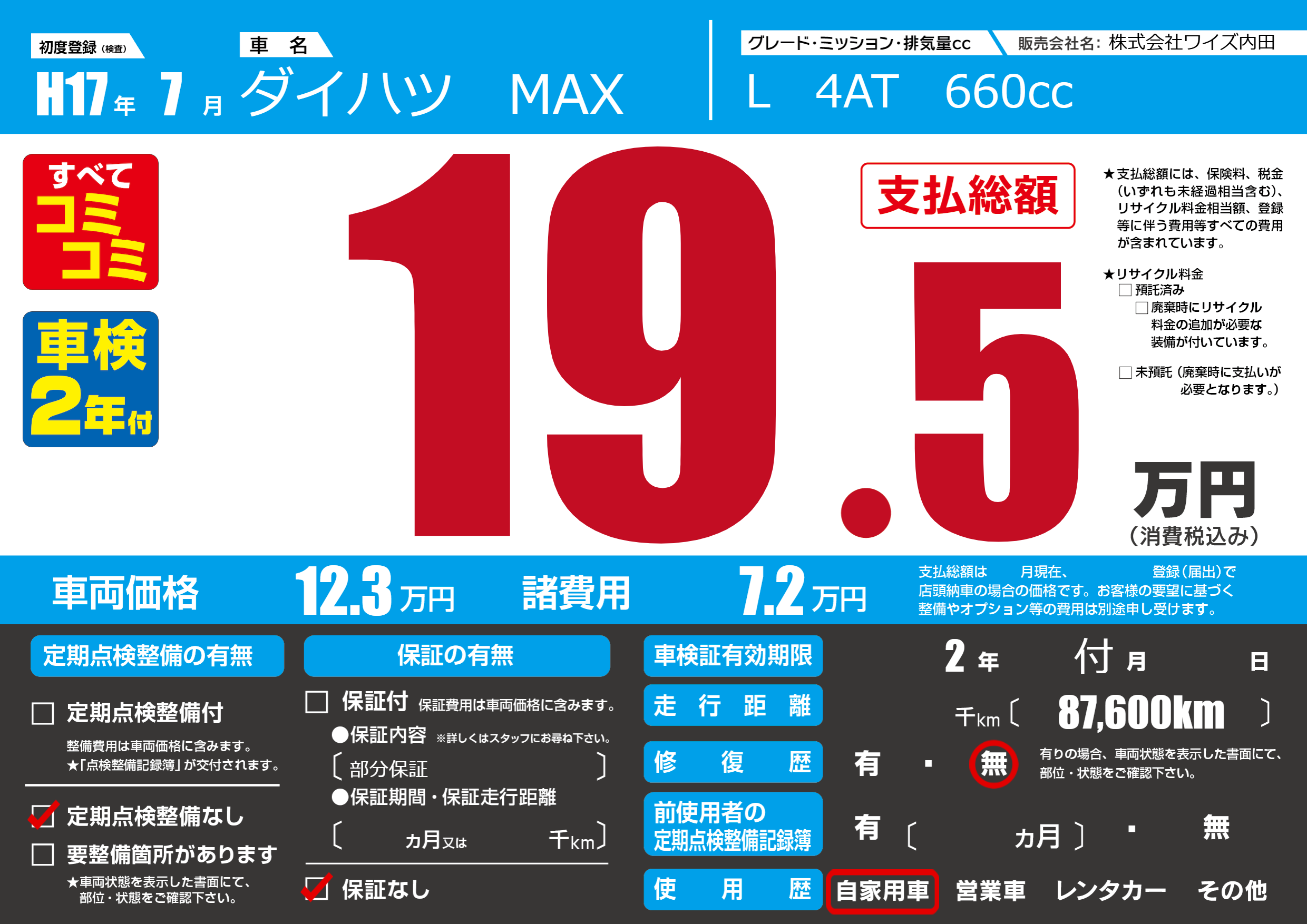 | 車名 | ダイハツ MAX | グレード ミッション 排気量 |