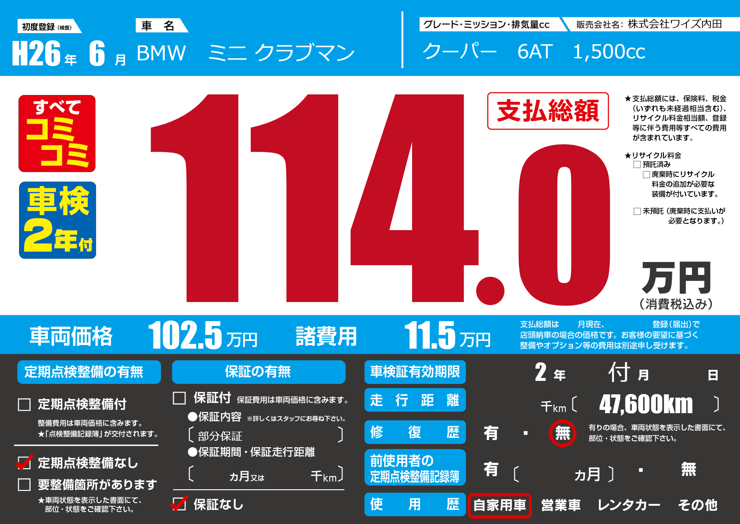 | 車名 | BMW ミニ クラブマン | グレード ミッション 排気量 |