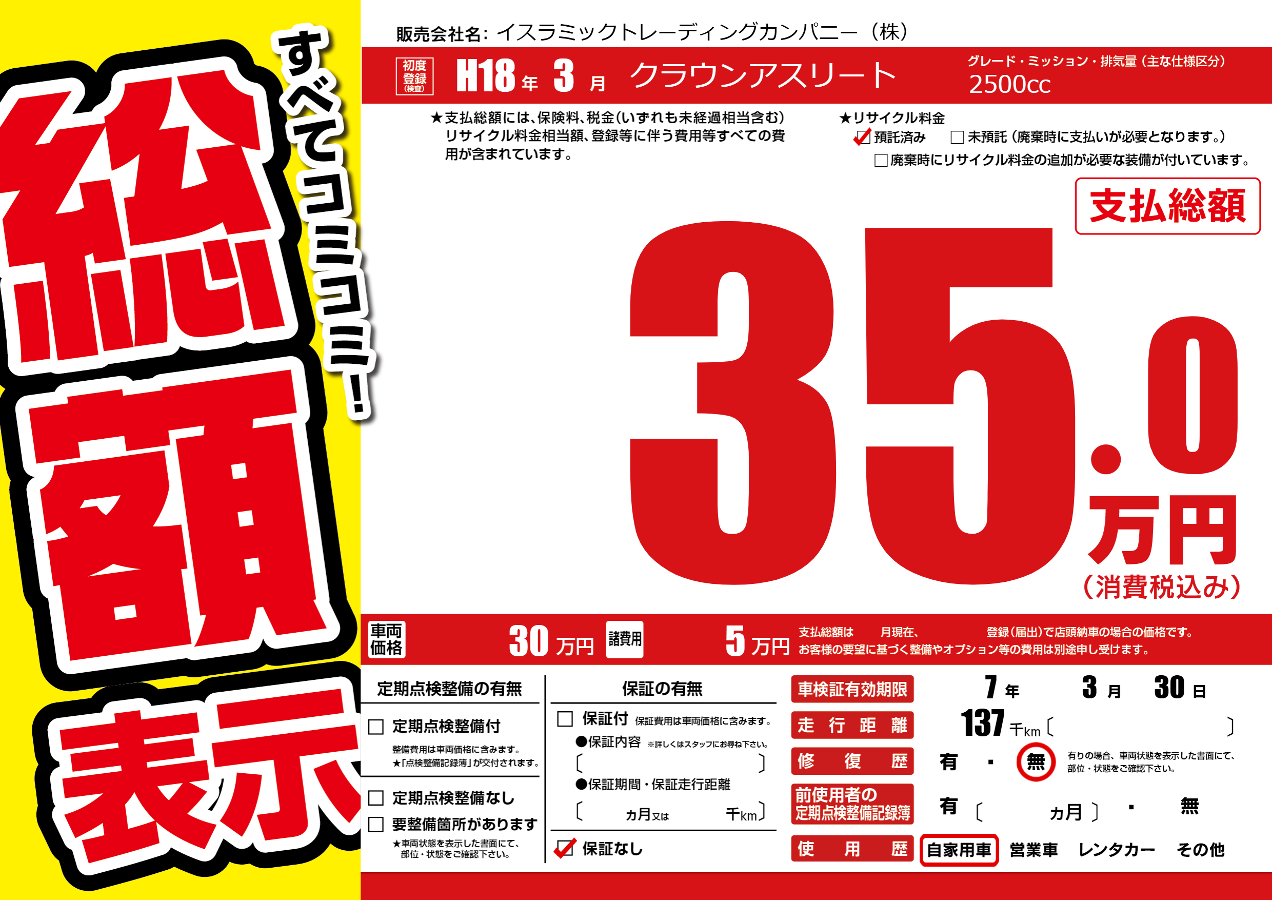 | 車名 | クラウンアスリート | グレード ミッション 排気量 |