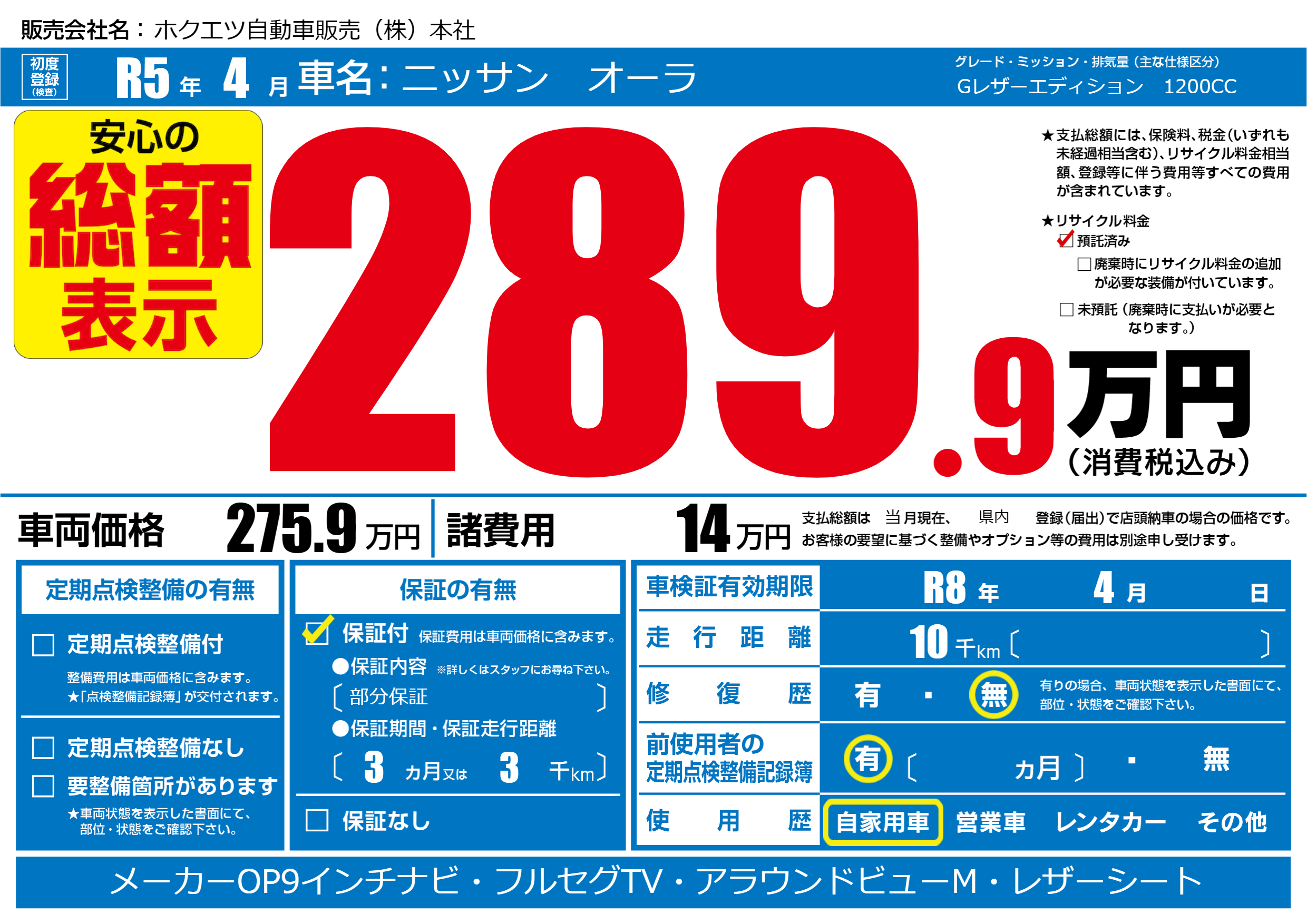 あり | リサイクル預託金相当額 | ( 0円)が別途必要 |