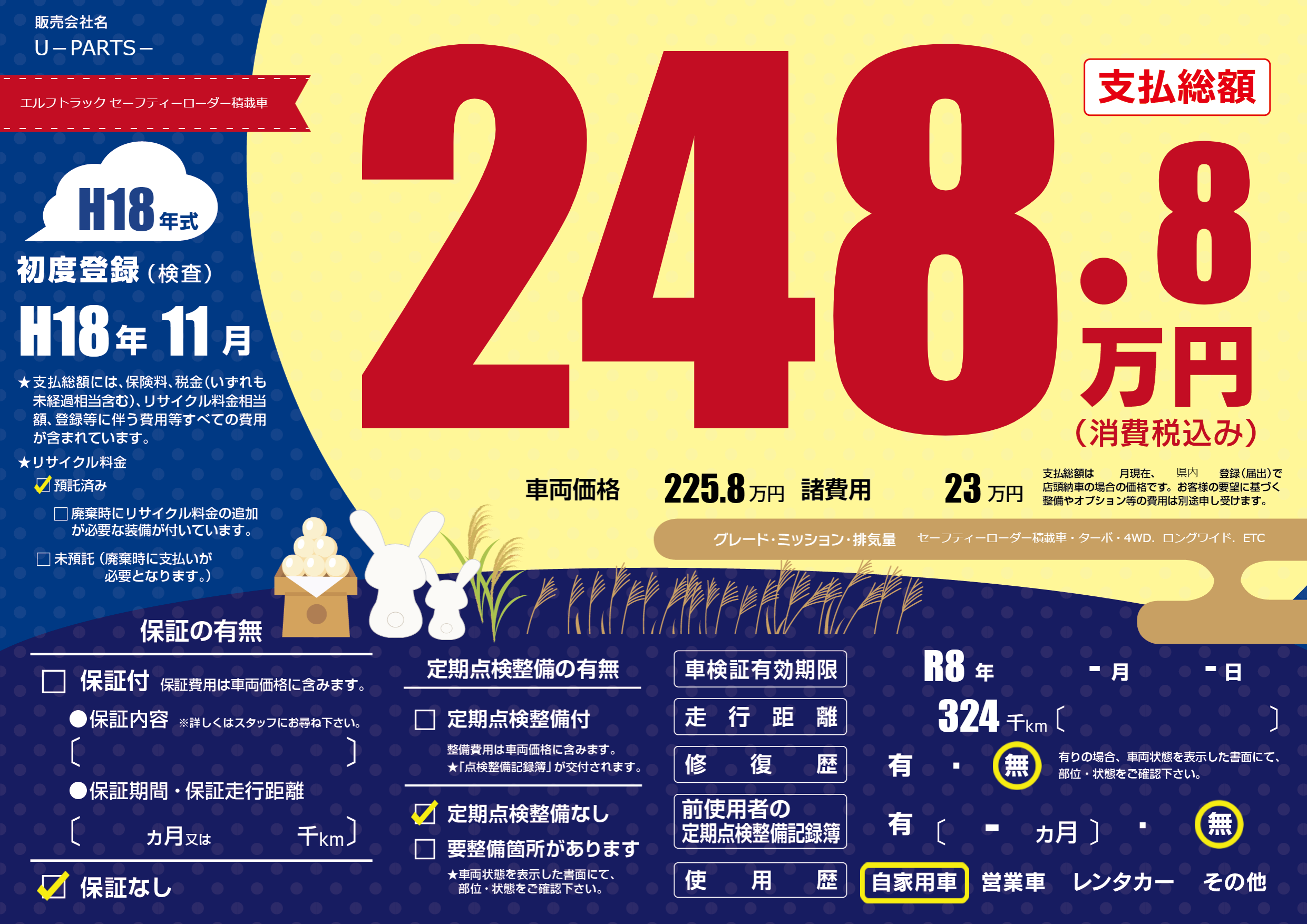 | 走行キロ | 32.4万km | 初年度登録 | H18年11月 |