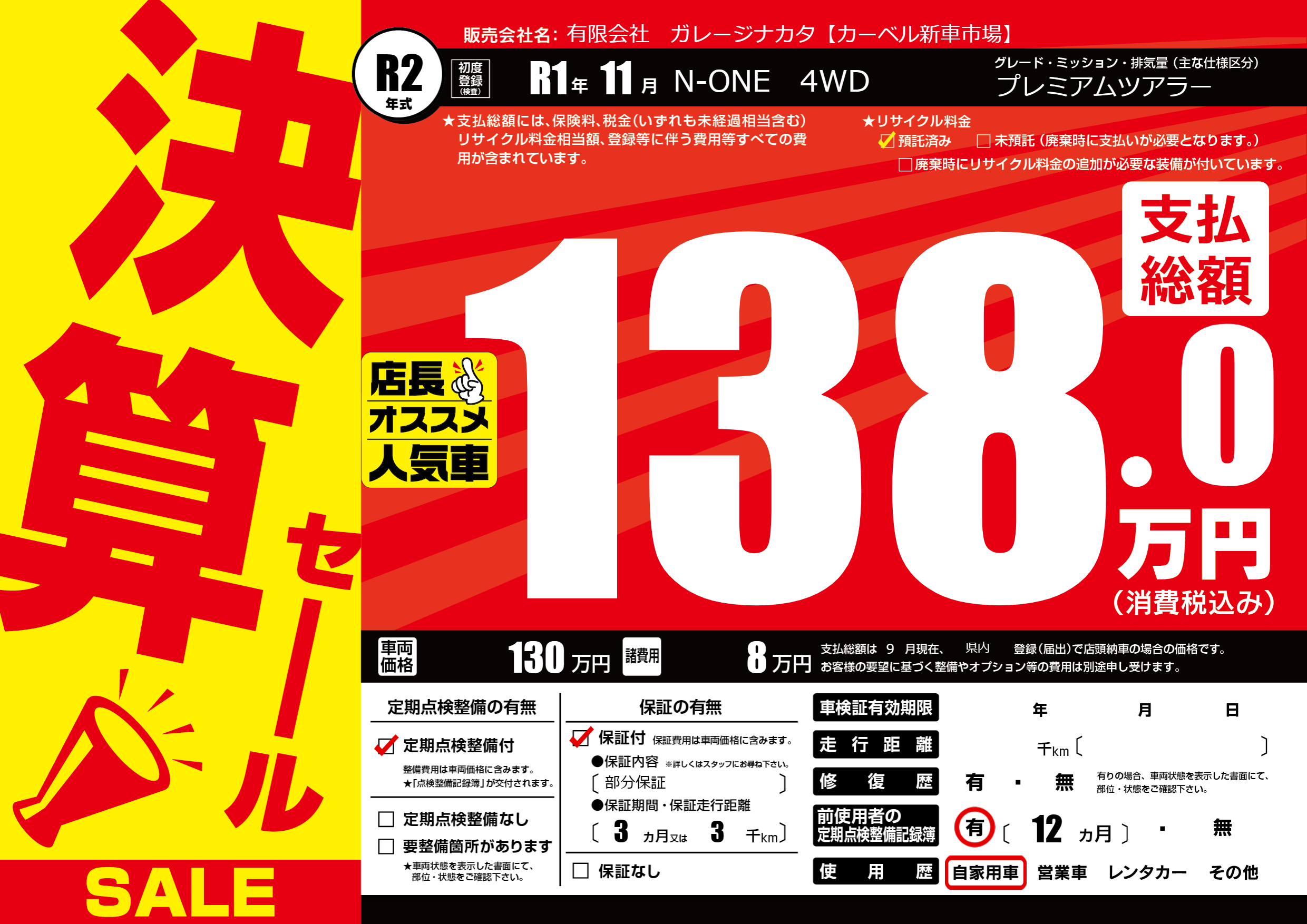| 車名 | N-ONE 4WD | グレード ミッション 排気量 |