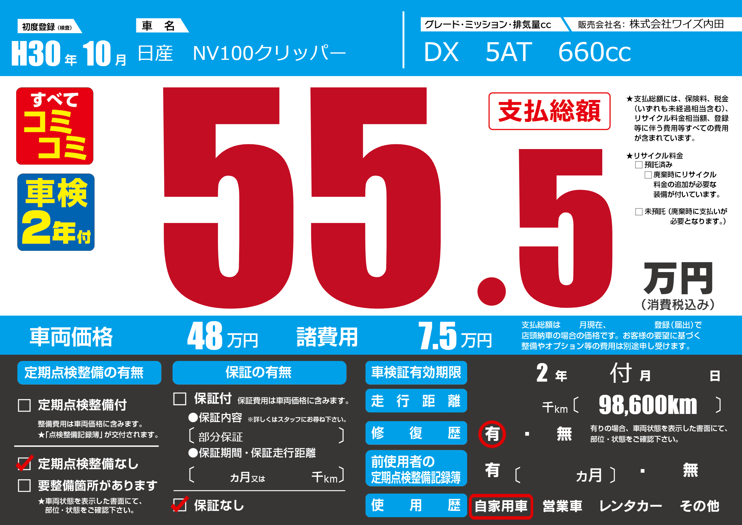 | 車名 | 日産 NV100クリッパー | グレード ミッション 排気量 |