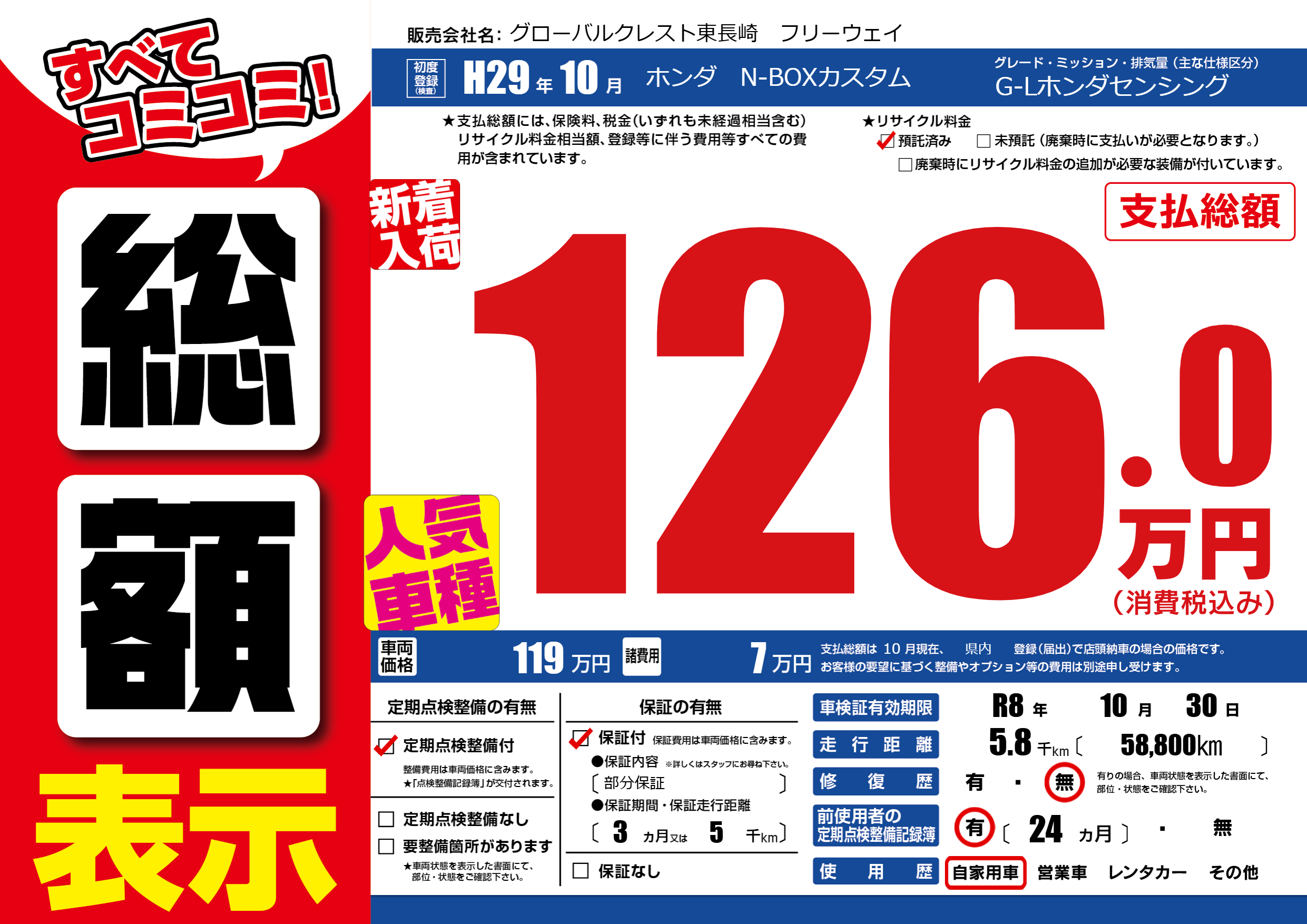 | 走行キロ | 0.5万km | 初年度登録 | H29年10月 |