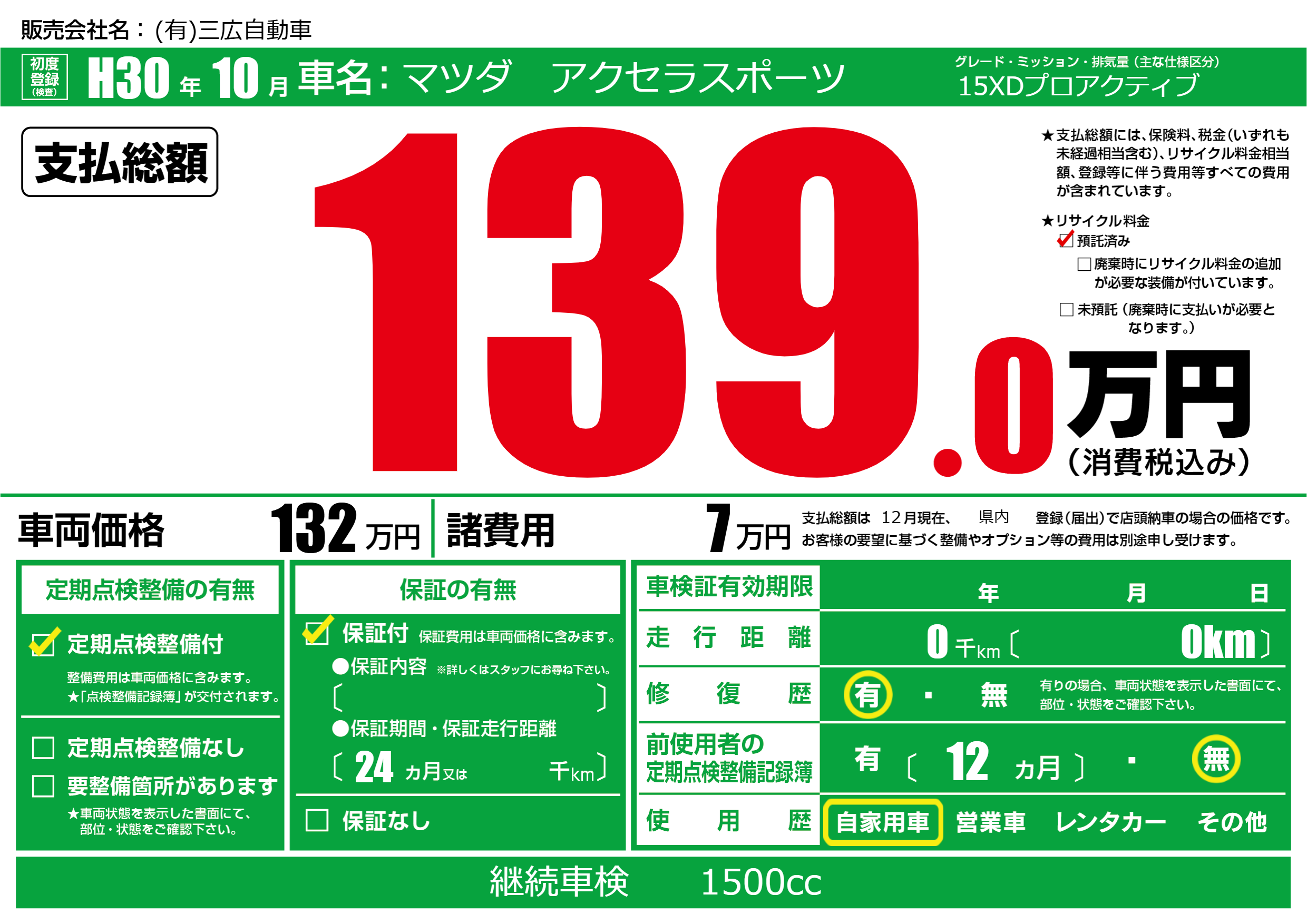 | 車名 | マツダ アクセラスポーツ | グレード ミッション 排気量 |