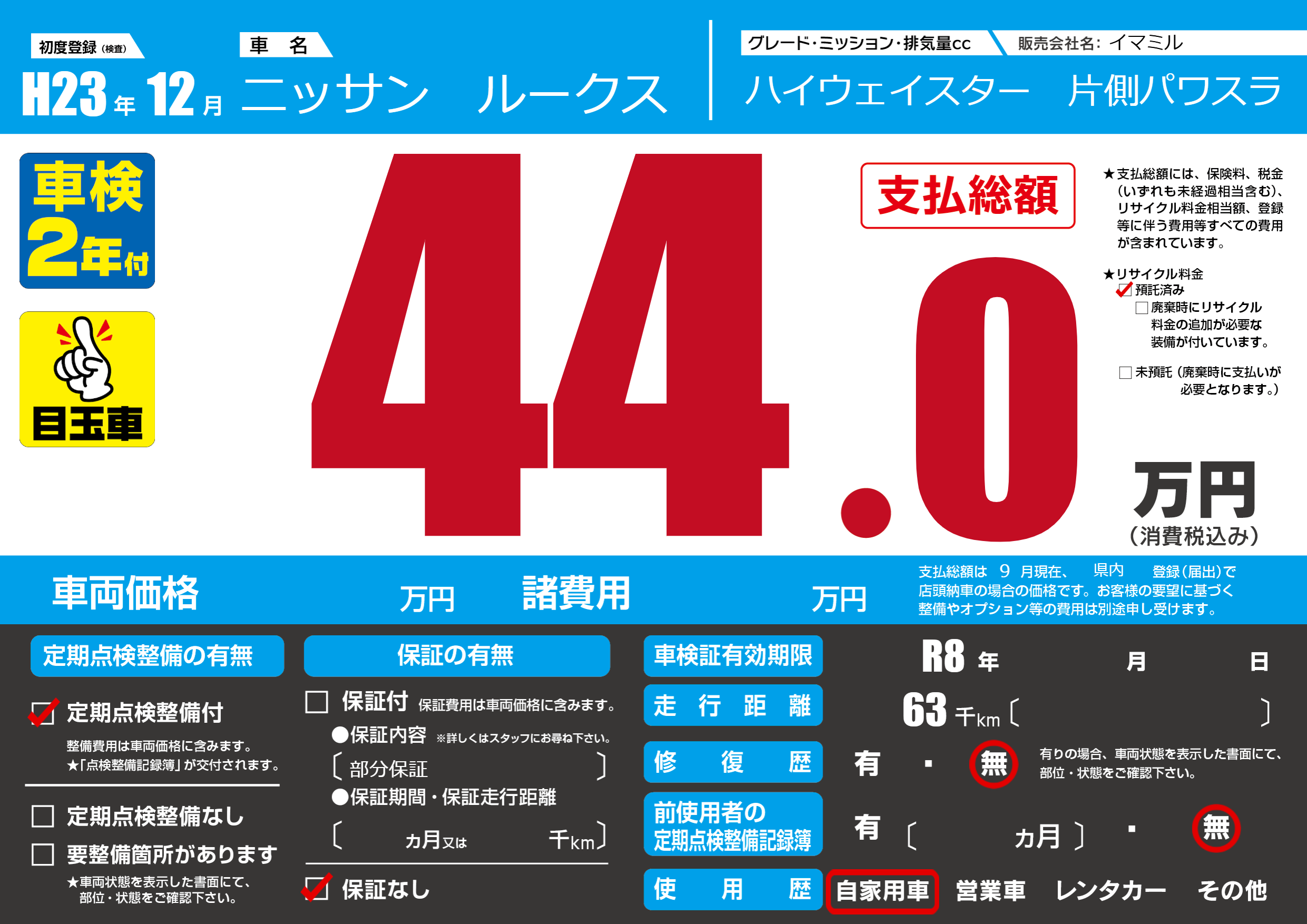 | 走行キロ | 6.3万km | 初年度登録 | H23年12月 |