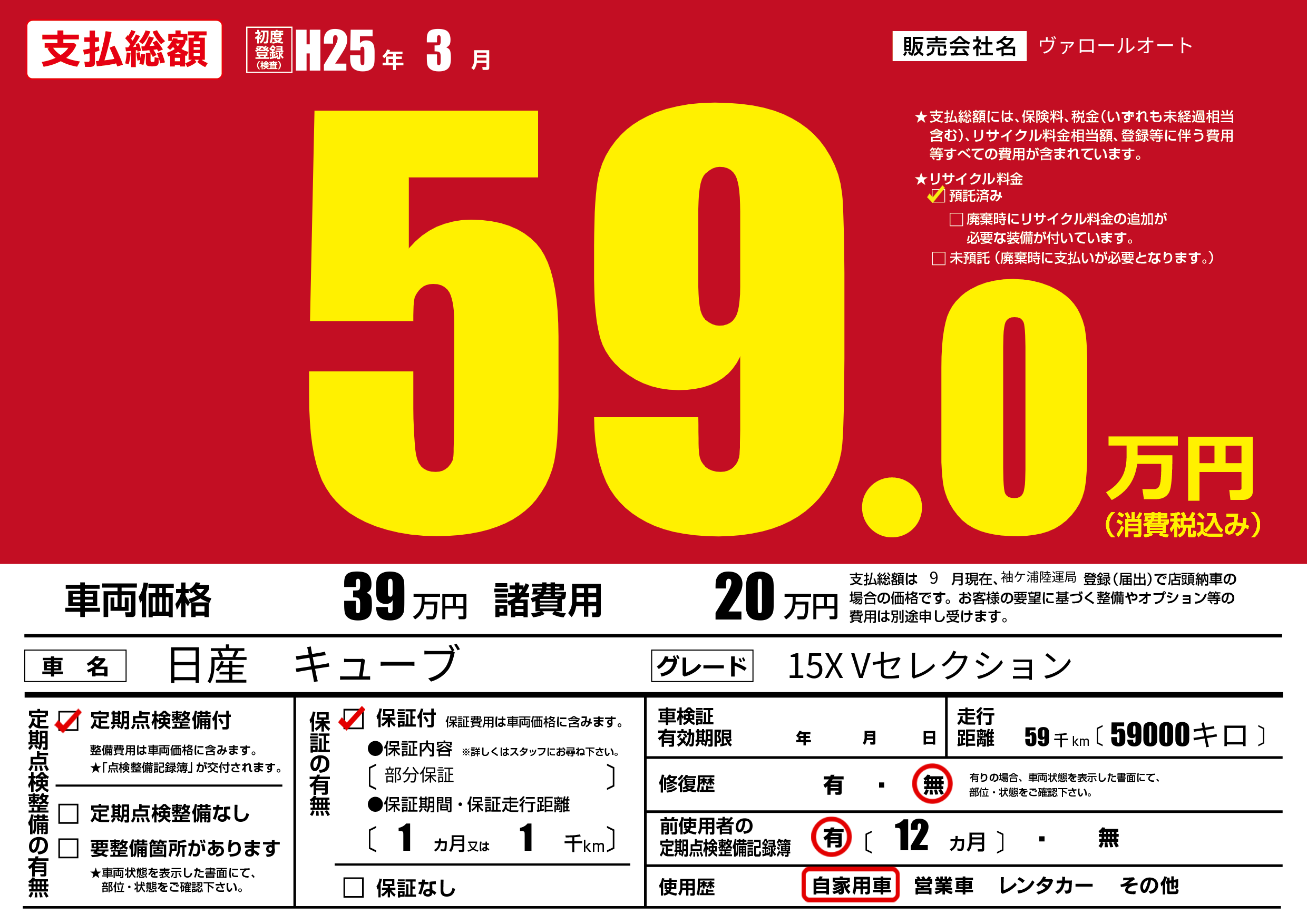 | 車名 | 日産 キューブ | グレード ミッション 排気量 |