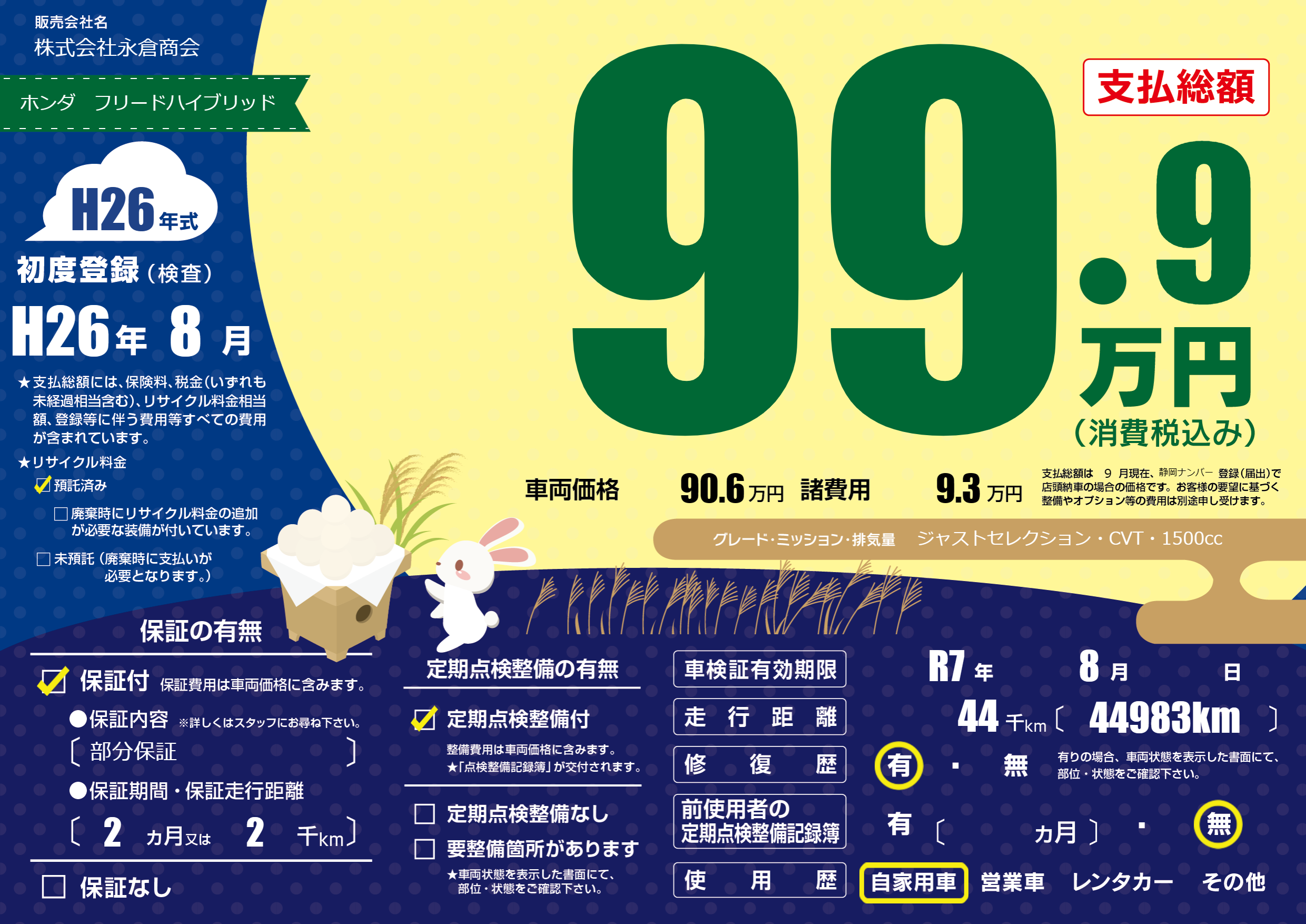 | 車名 | ホンダ フリードハイブリッド | グレード ミッション 排気量 |