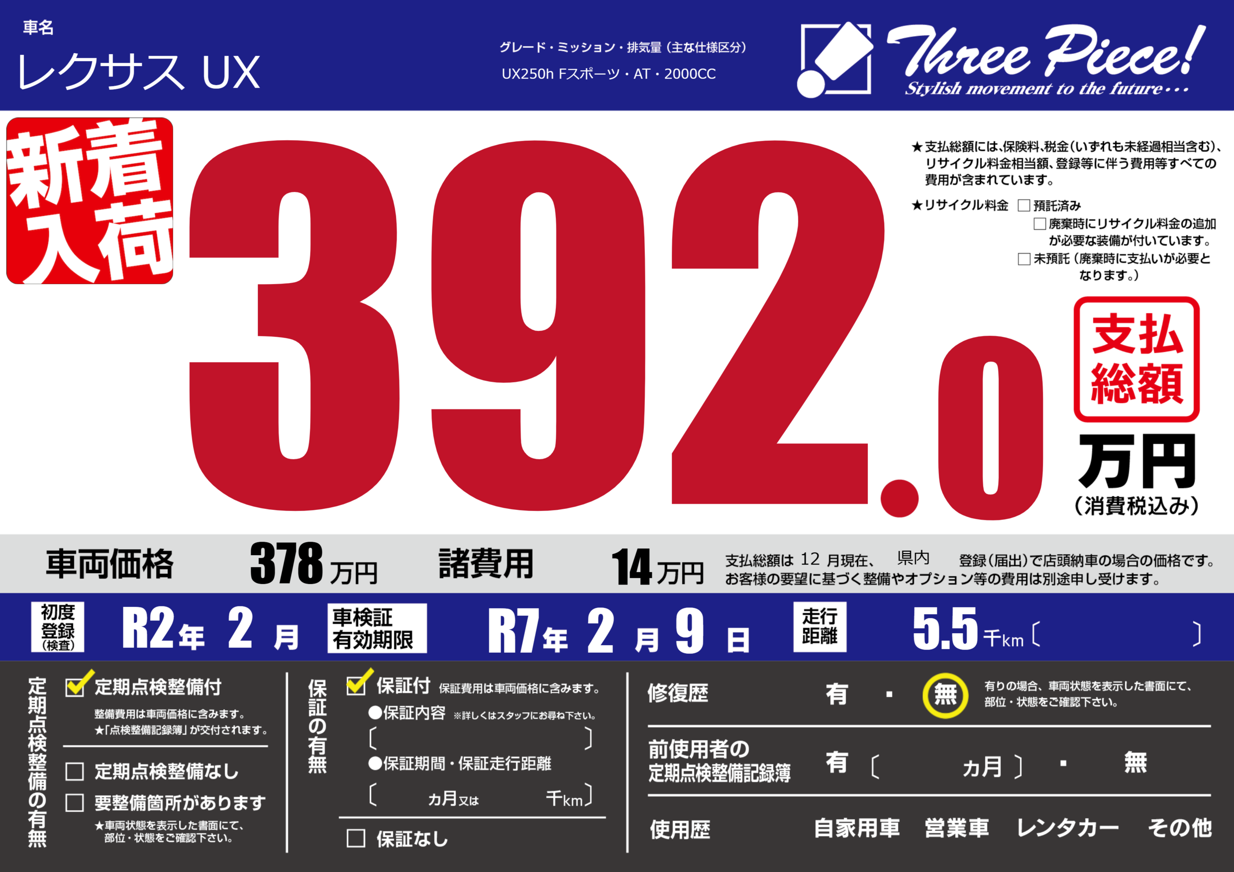 | 車名 | レクサス UX | グレード ミッション 排気量 |