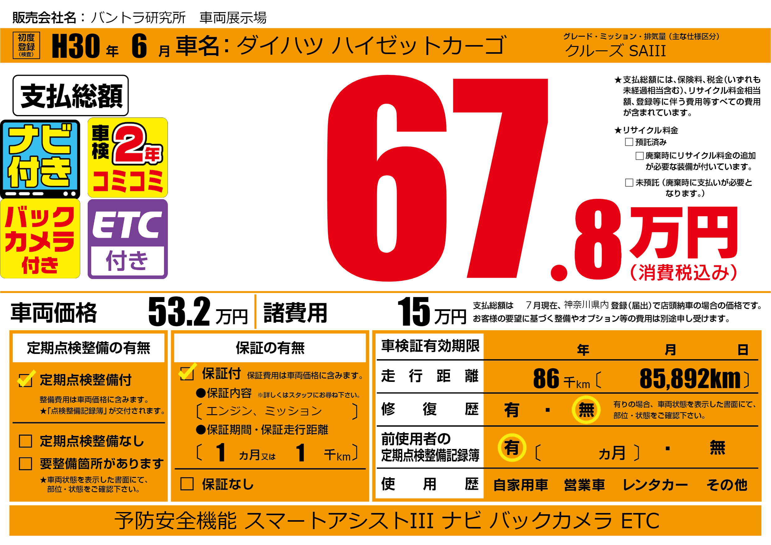 | 車名 | ダイハツ ハイゼットカーゴ | グレード ミッション 排気量 |