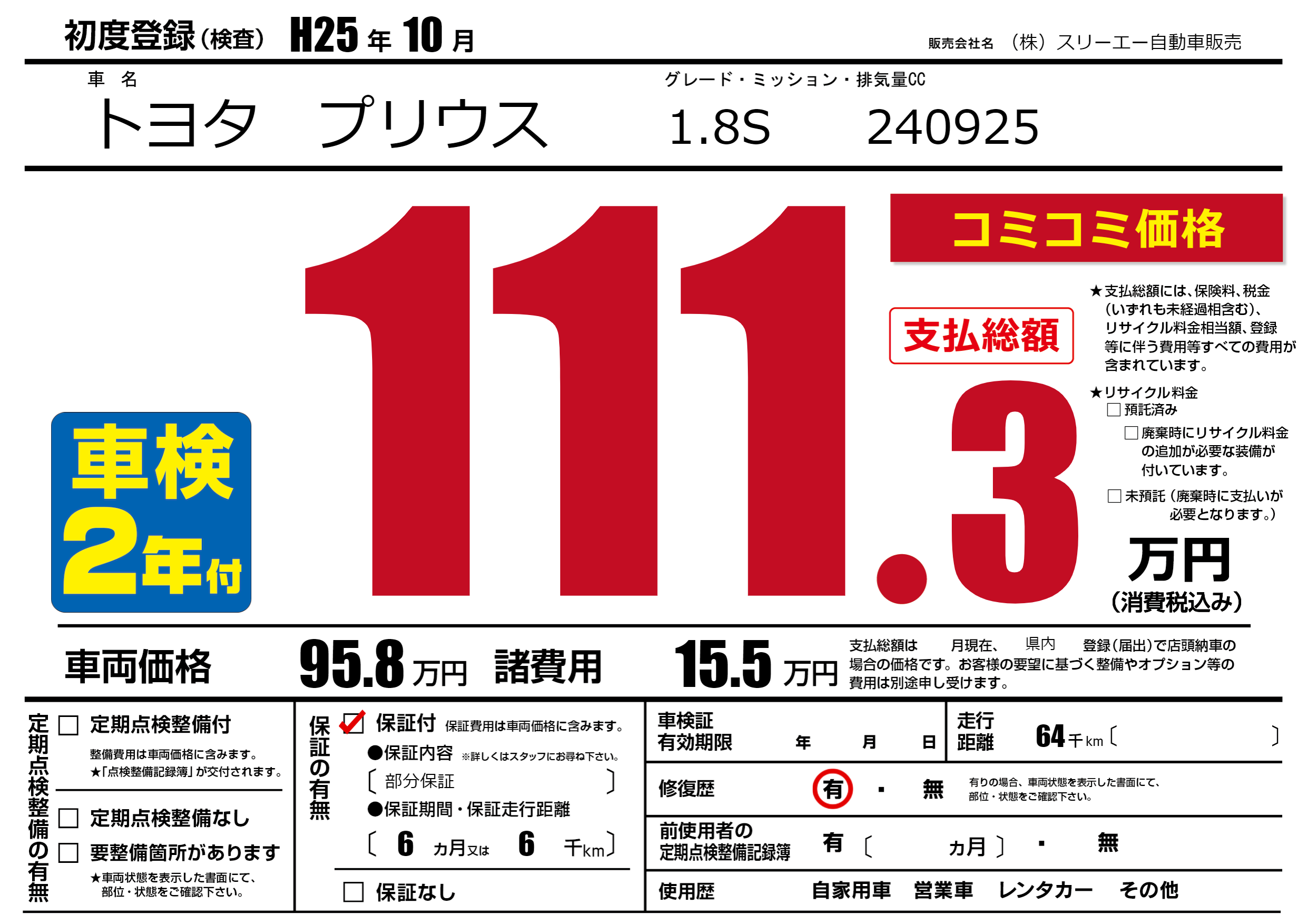 | 車名 | トヨタ プリウス | グレード ミッション 排気量 |