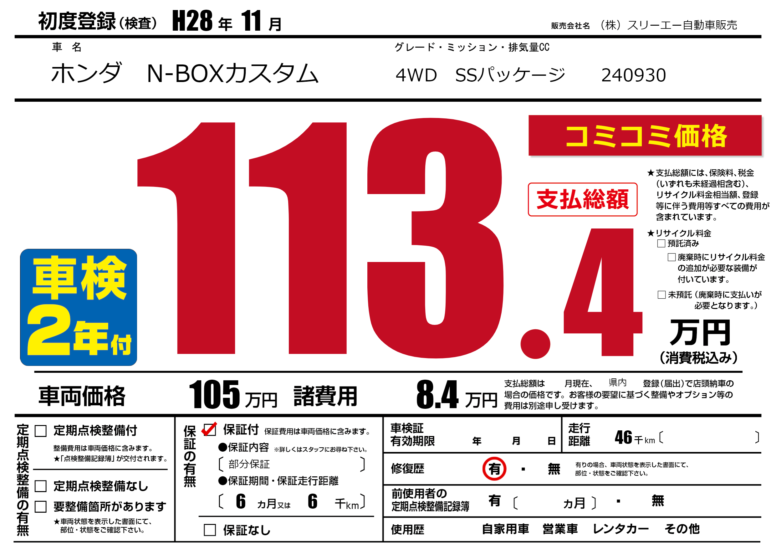 保証付き 保証内容(部分保証) 6ヶ月または(6)千kmまで |