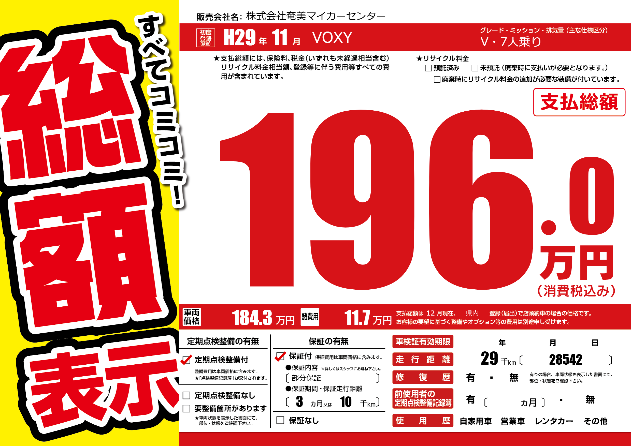 | 走行キロ | 2.9万km | 初年度登録 | H29年11月 |