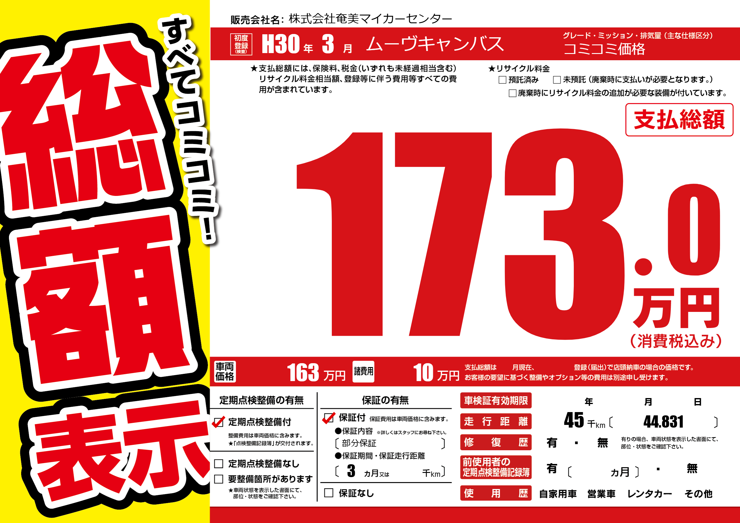 | 走行キロ | 4.5万km | 初年度登録 | H30年3月 |