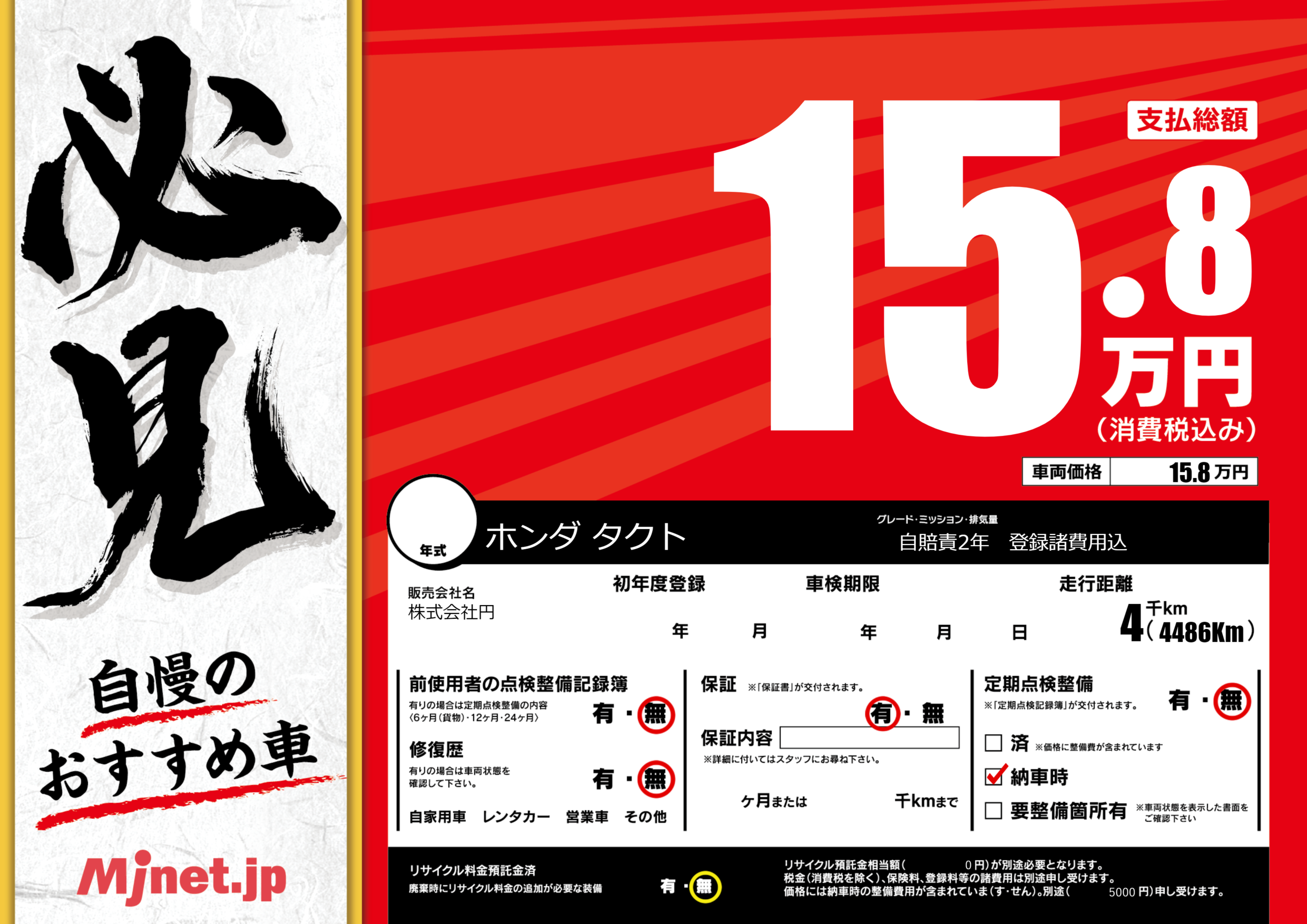 | 車名 | ホンダ タクト | グレード ミッション 排気量 |