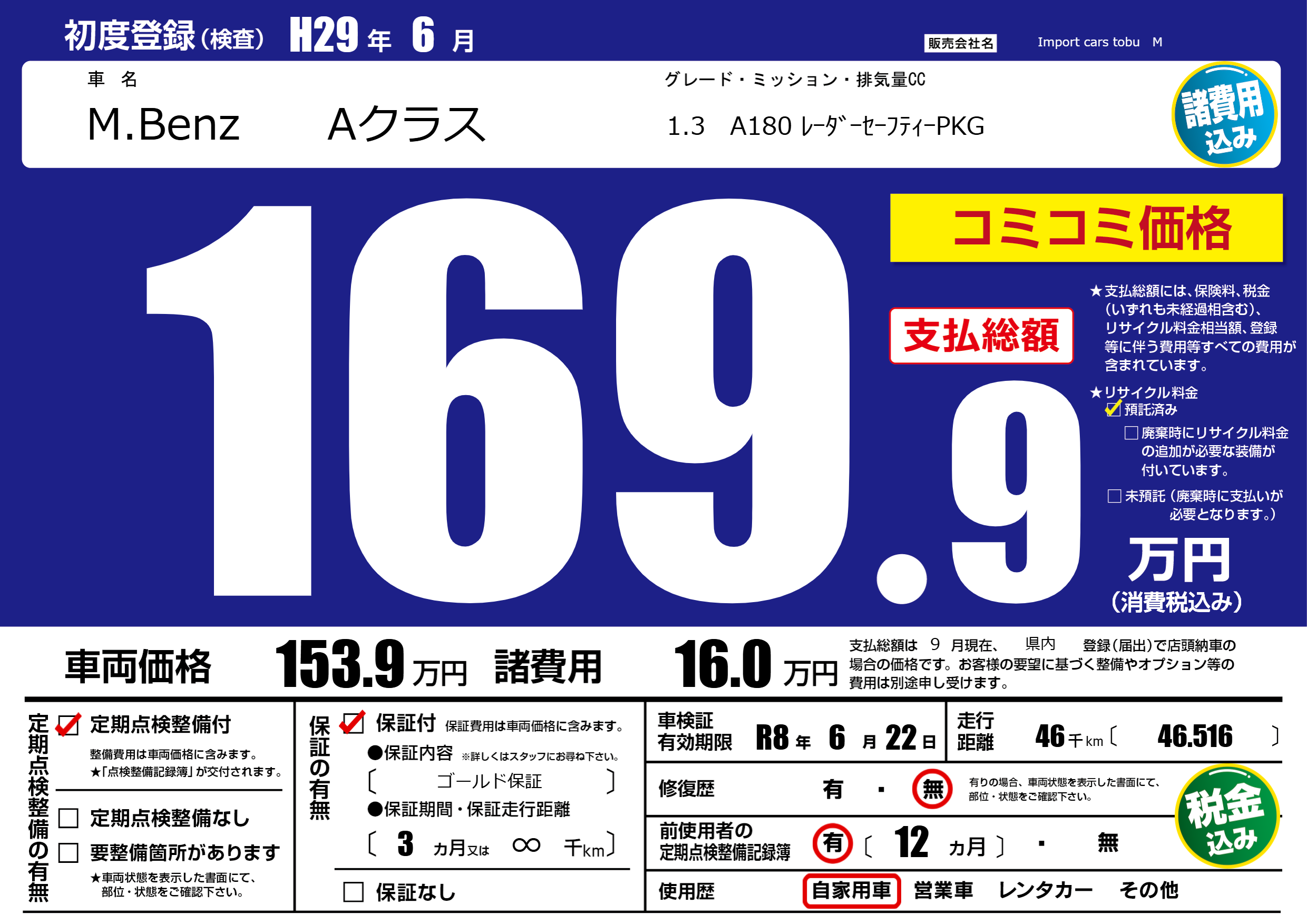 | 車名 | M.Benz Aクラス | グレード ミッション 排気量 |