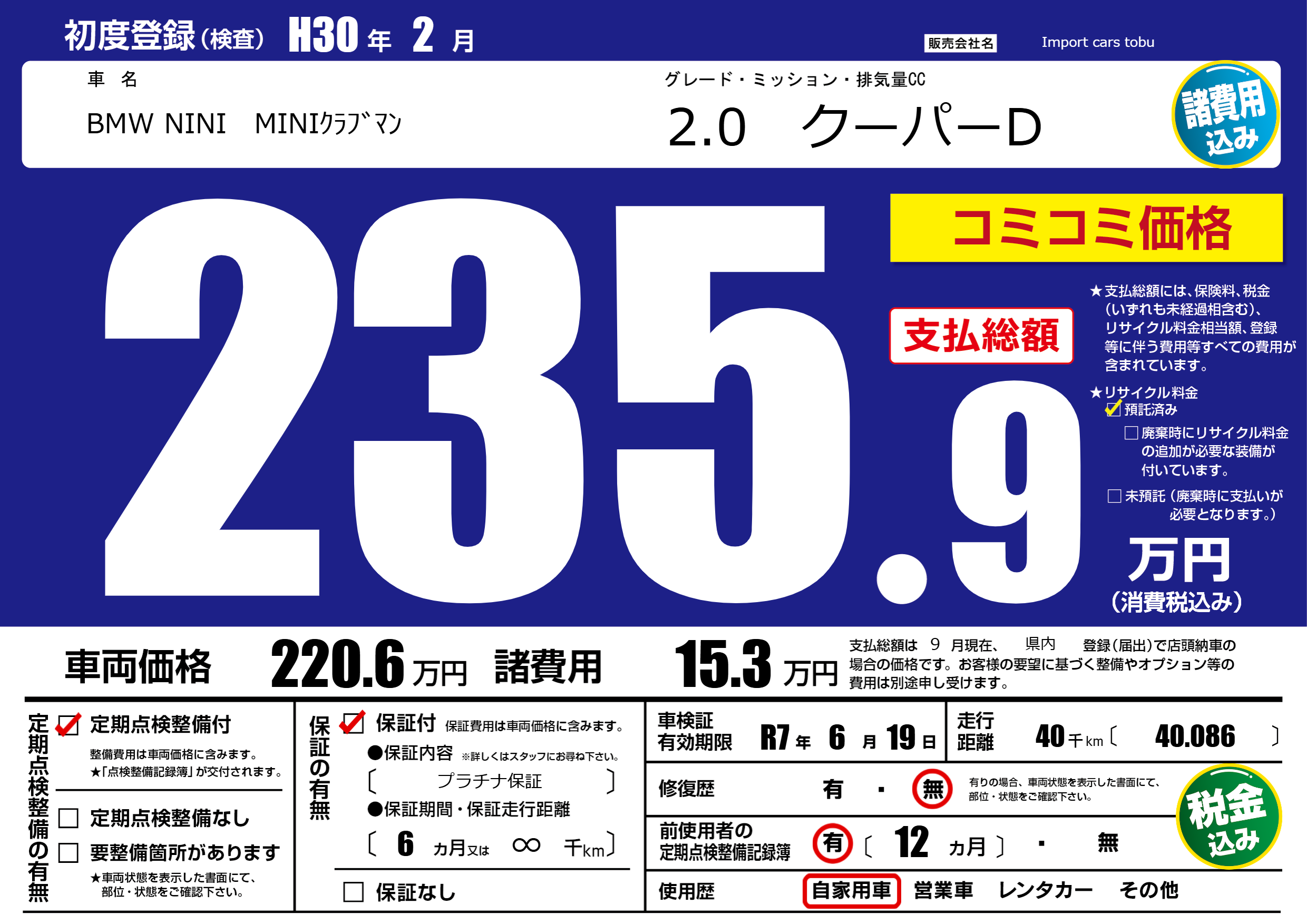 | 車名 | BMW NINI MINIクラブマン | グレード ミッション 排気量 |