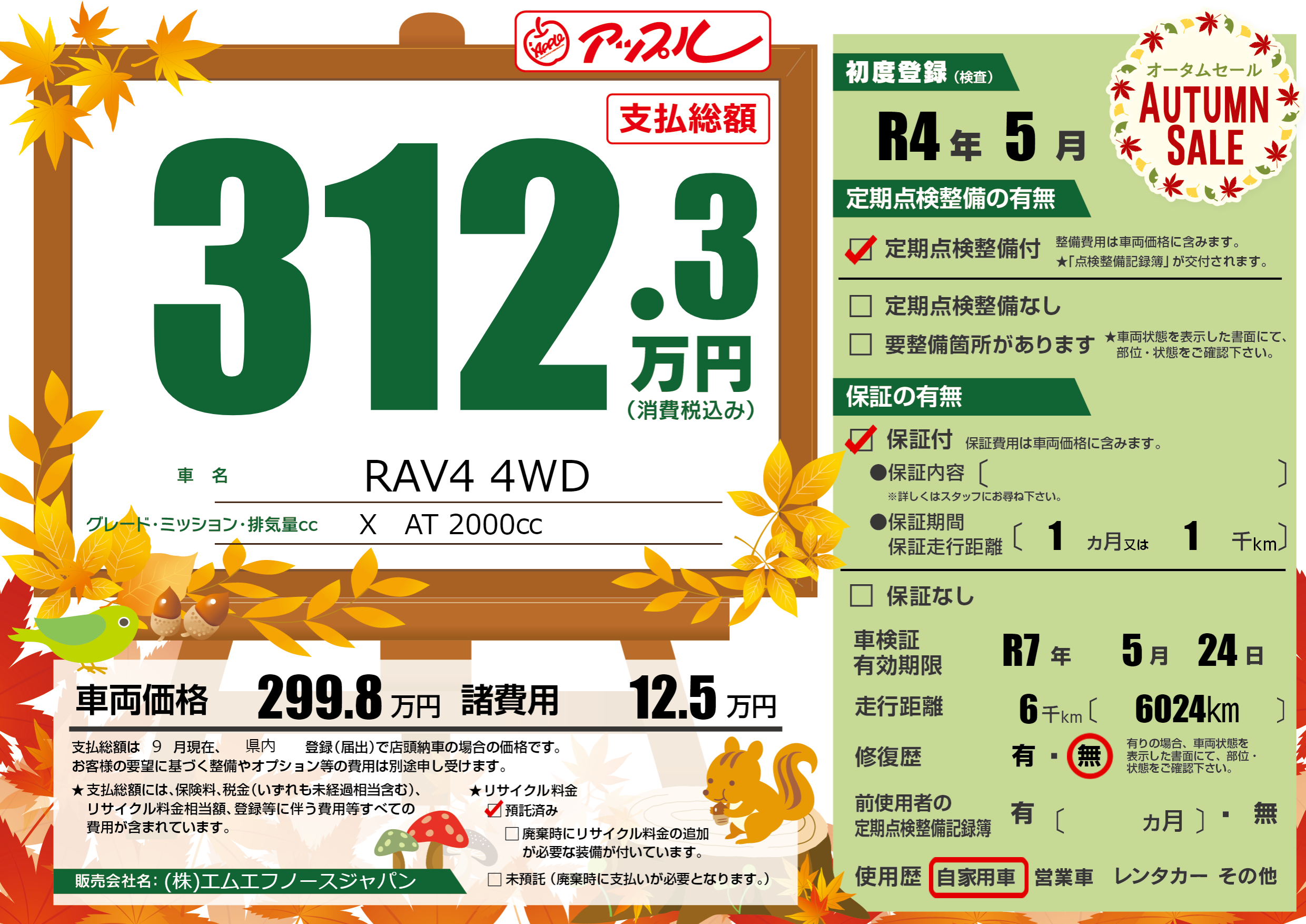 | 車名 | RAV4 4WD | グレード ミッション 排気量 |