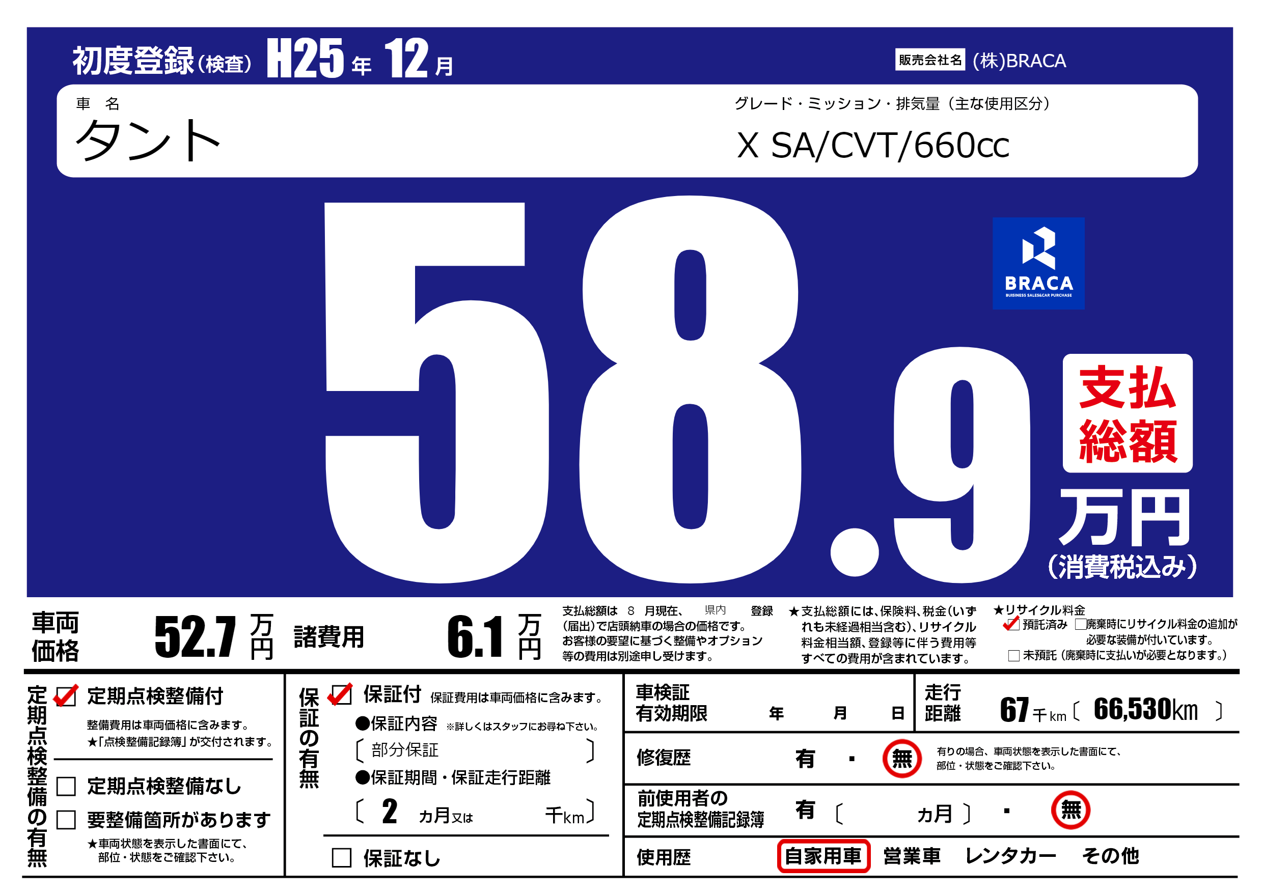 | 走行キロ | 6.7万km | 初年度登録 | H25年12月 |