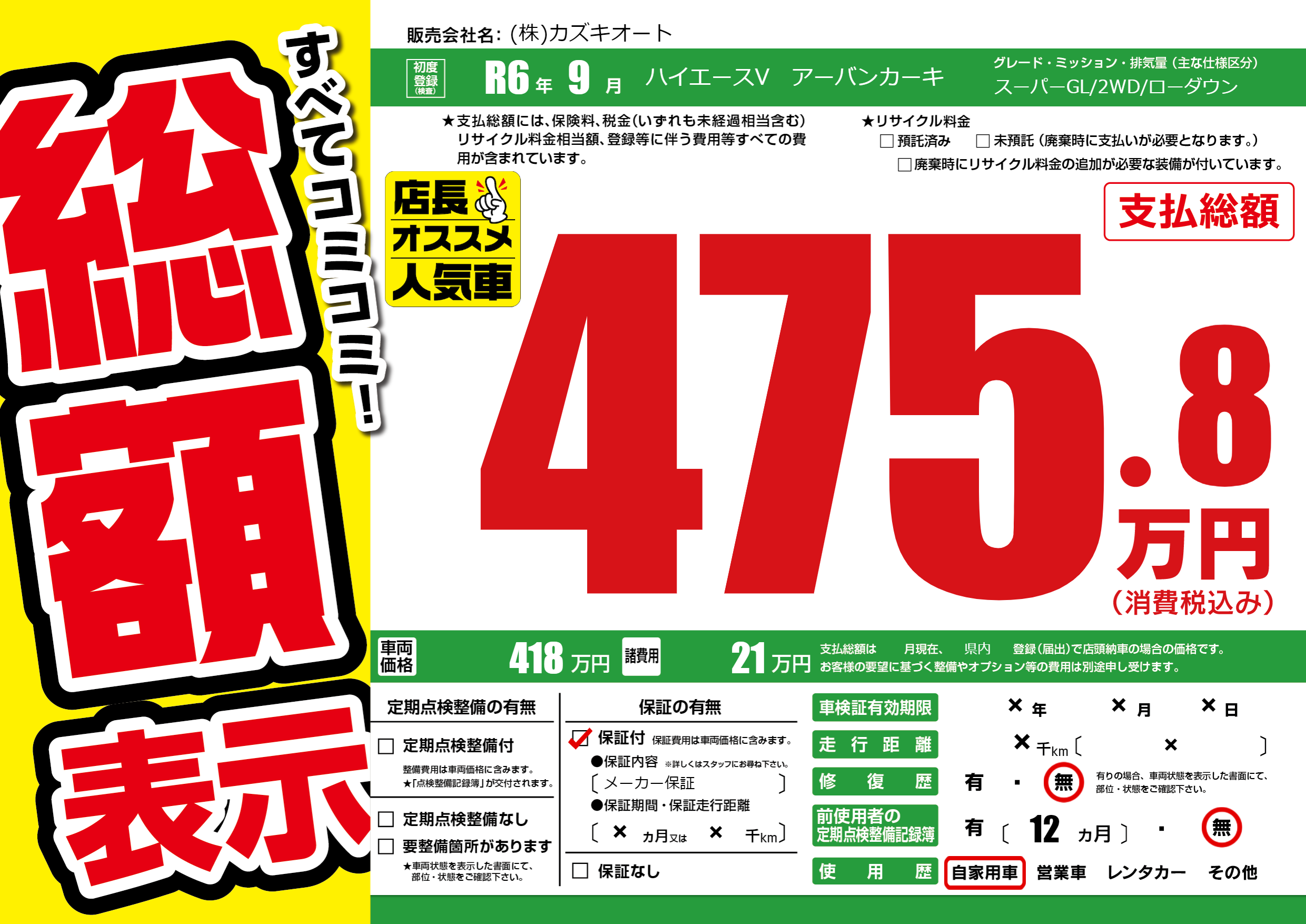 保証付き 保証内容(メーカー保証) ×ヶ月または×千km |