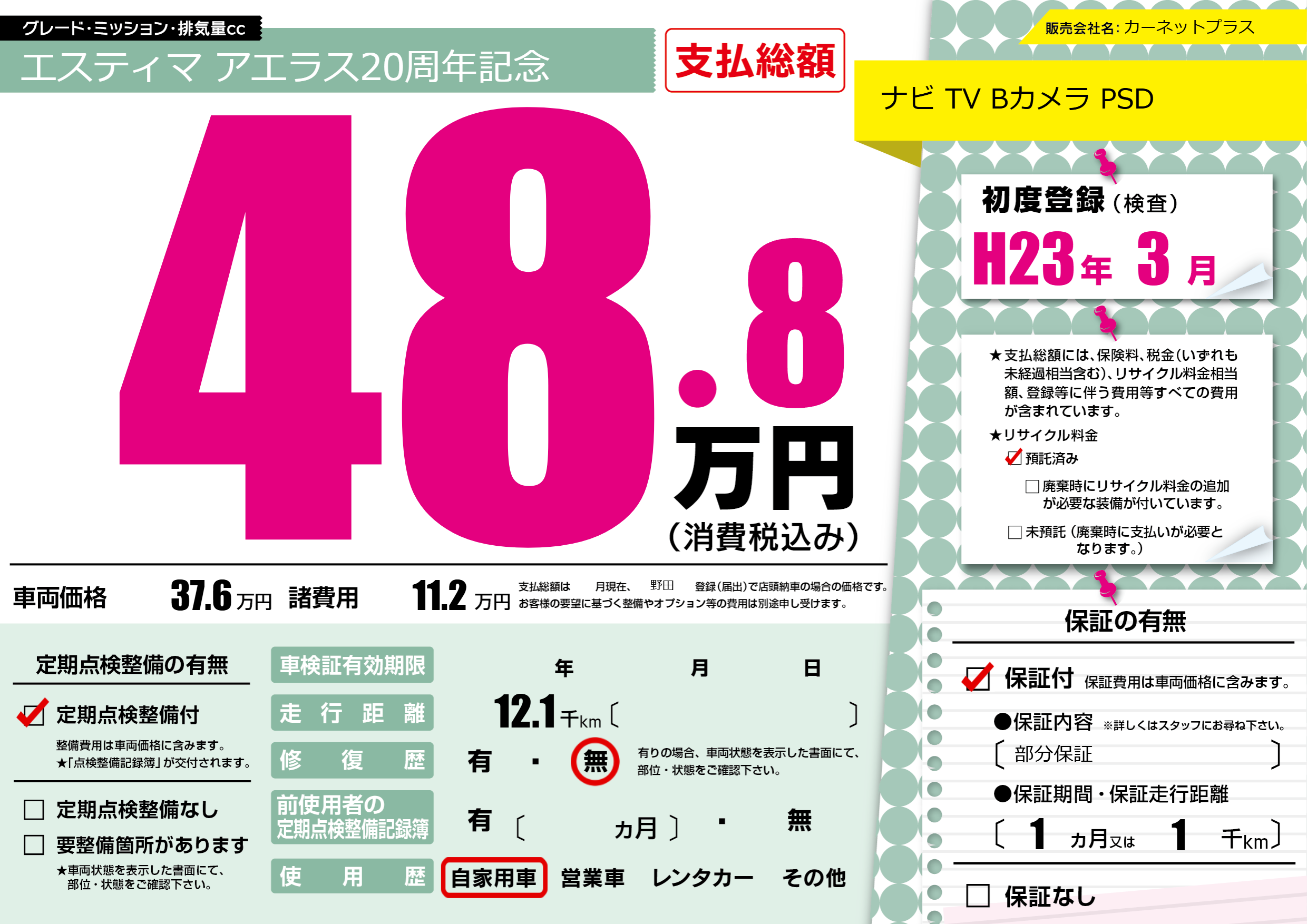 | 車名 | ナビ TV Bカメラ PSD | グレード ミッション 排気量 |