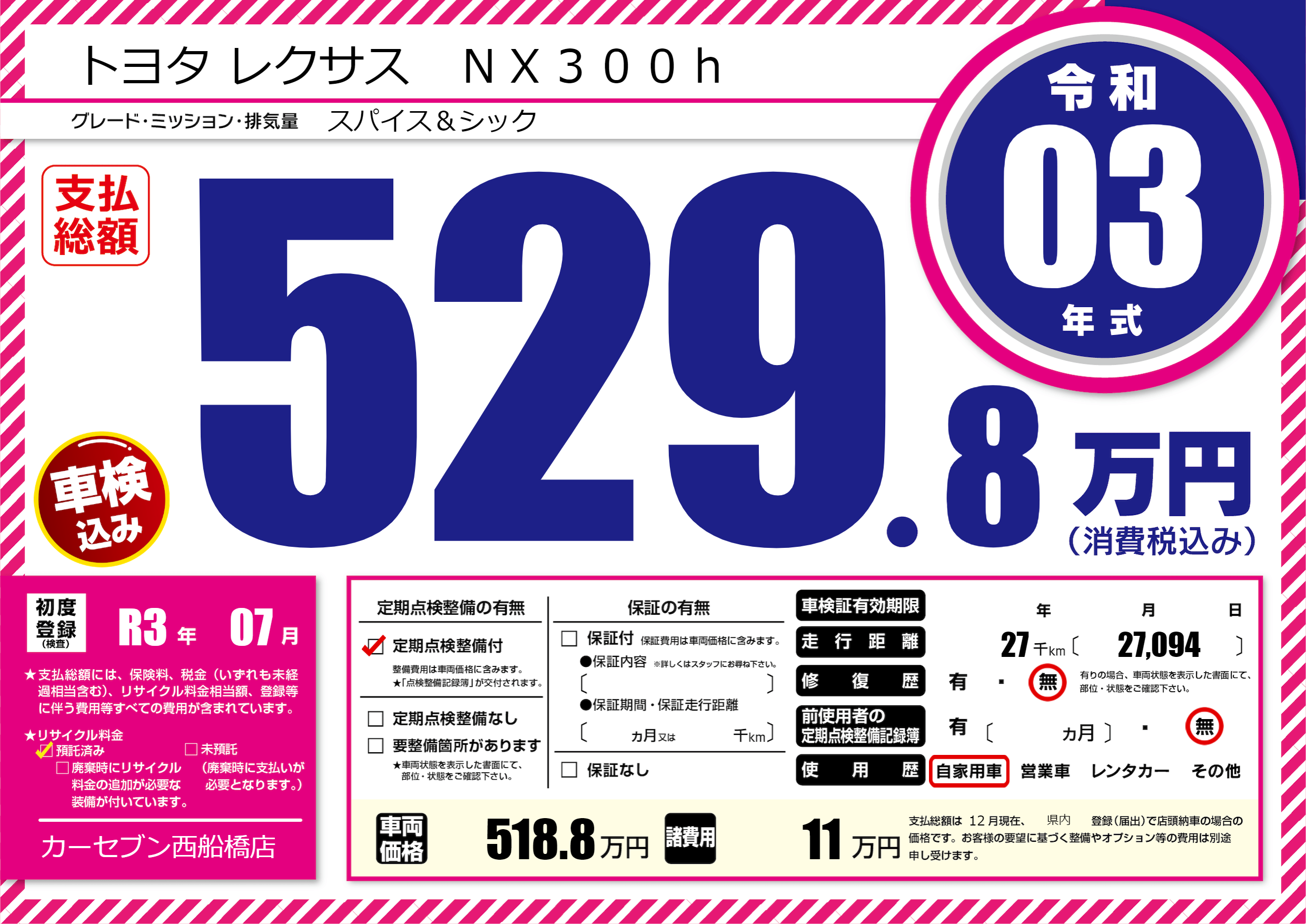 | 車名 | トヨタ レクサス NX300h | グレード ミッション 排気量 |