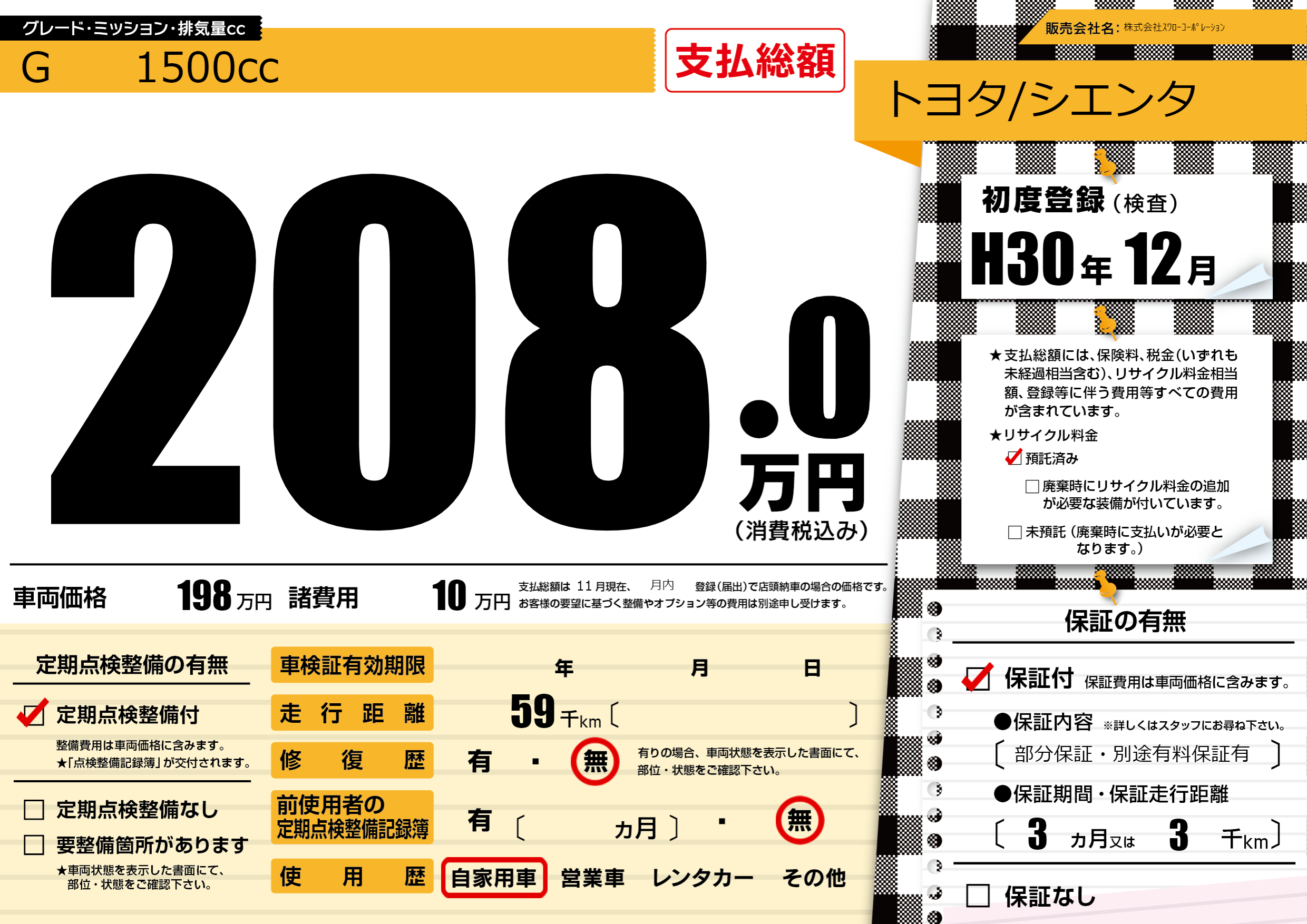 | 車名 | トヨタ/シエンタ | グレード ミッション 排気量 |