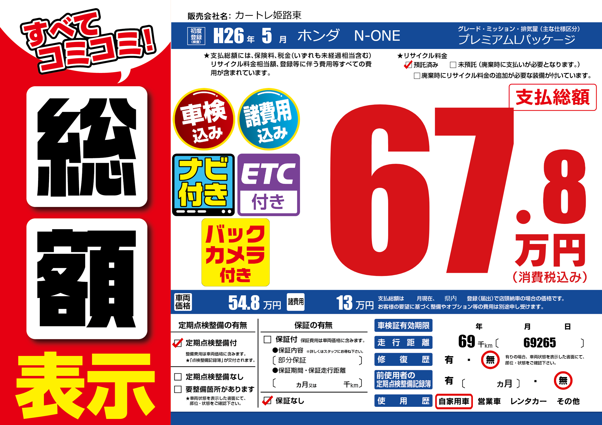 | 車名 | ホンダ N-ONE | グレード ミッション 排気量 |