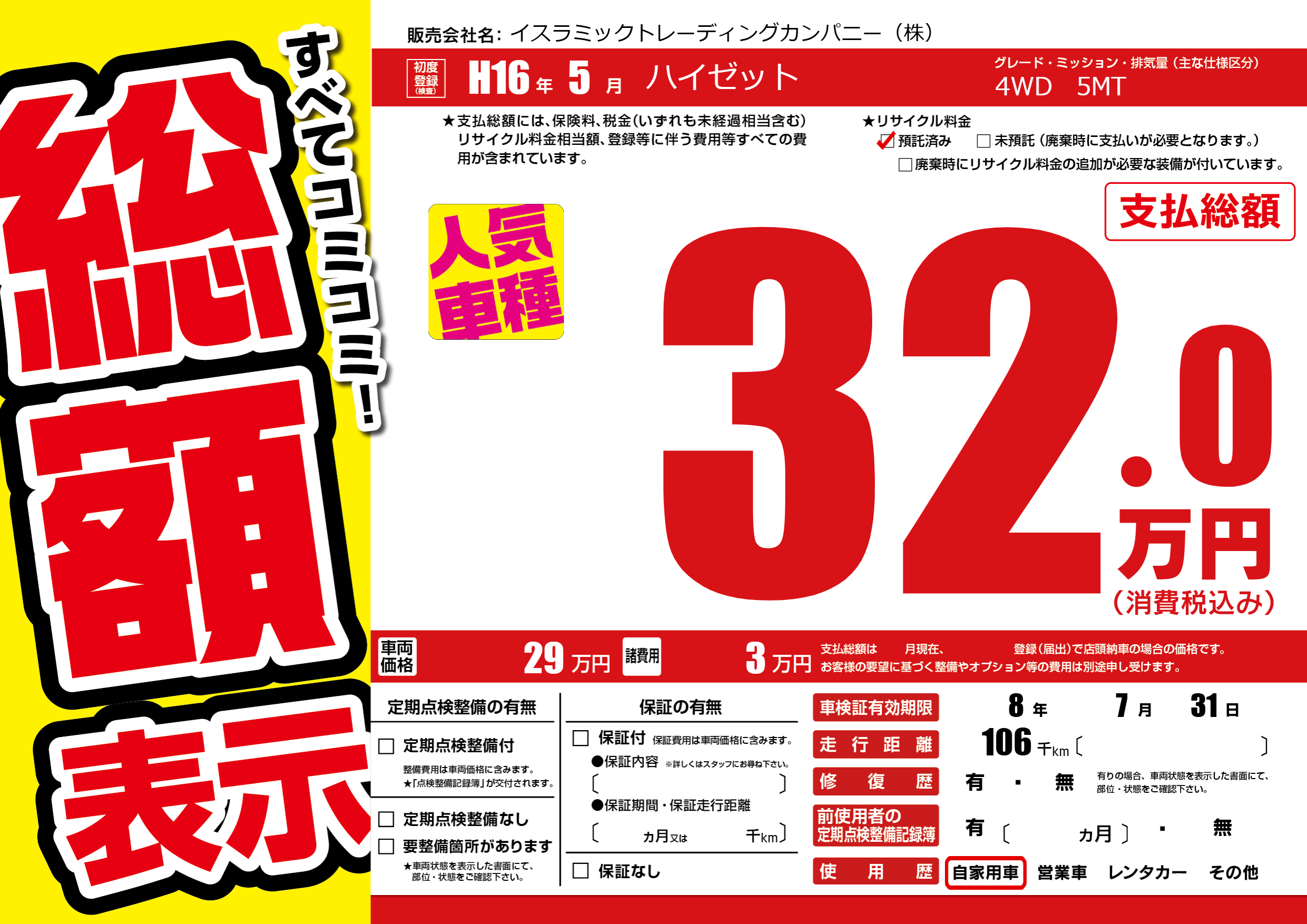 | 走行キロ | 10.6万km | 初年度登録 | H16年5月 |