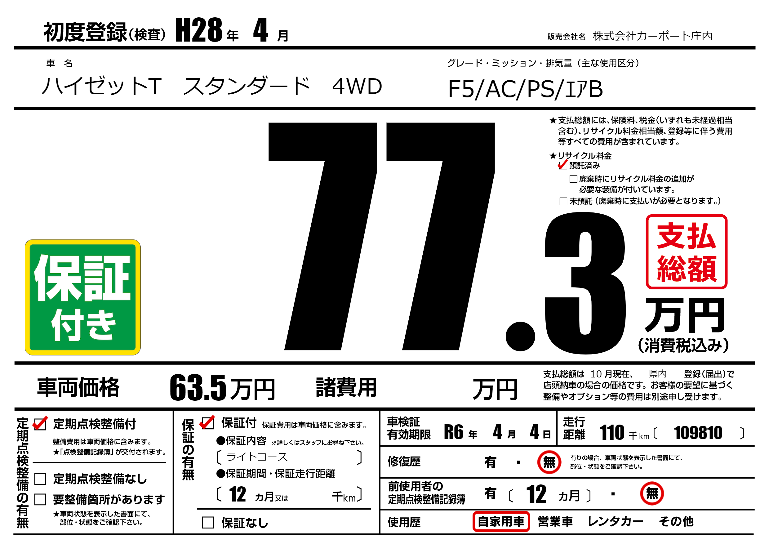 | 車名 | ハイゼットT スタンダード 4WD | グレード ミッション 排気量 |
