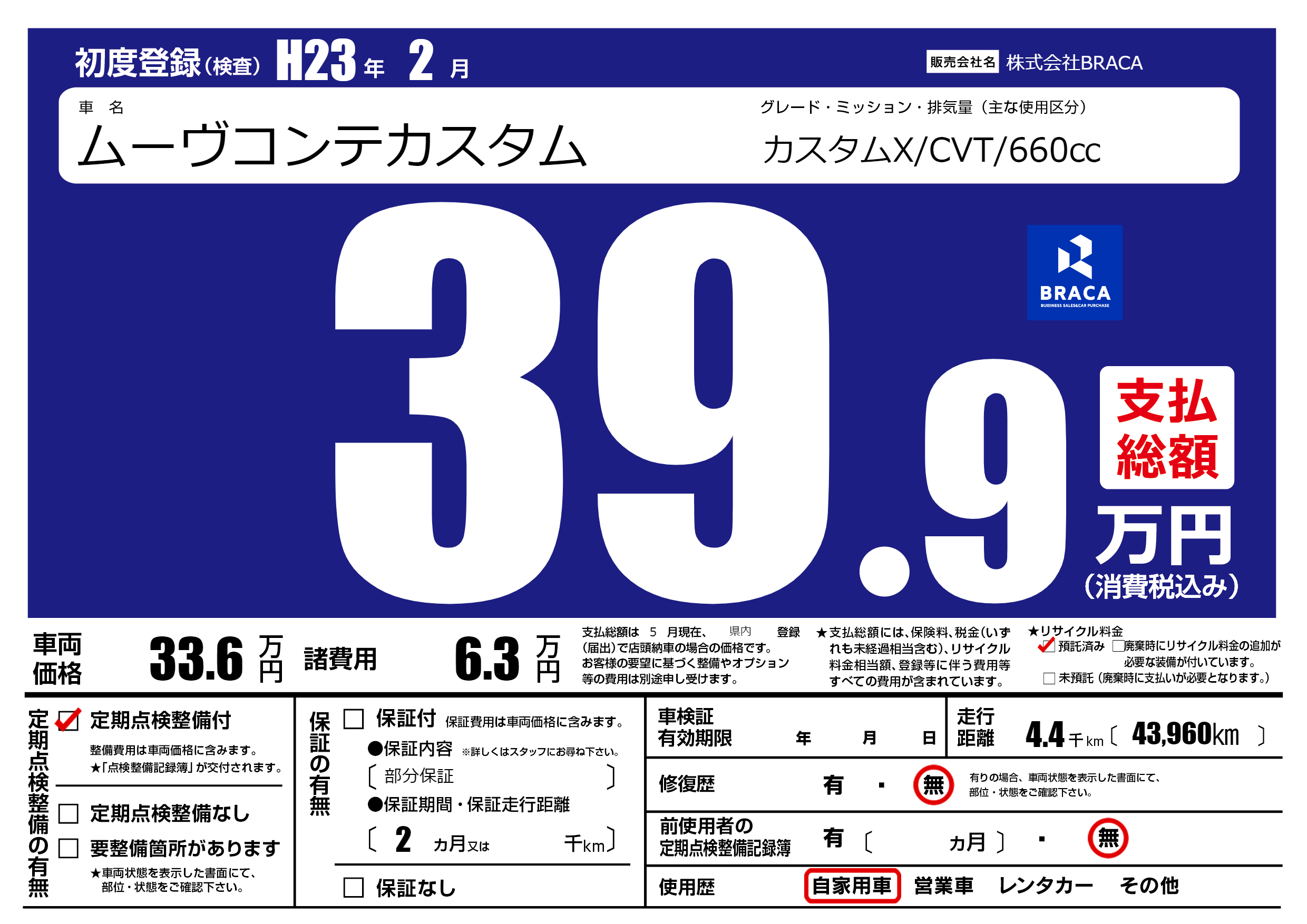 | 走行キロ | 0.4万km | 初年度登録 | H23年2月 |