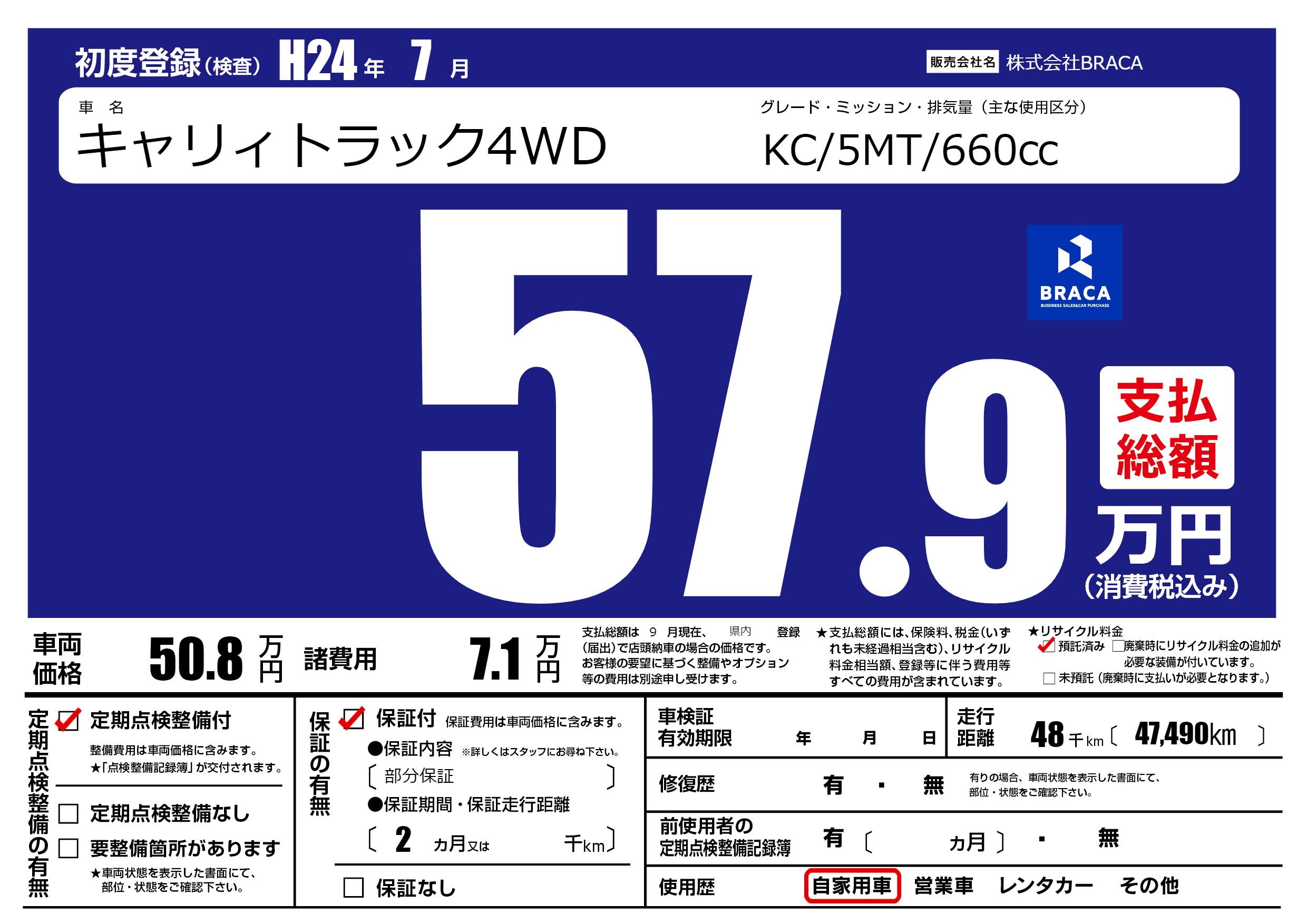 | 走行キロ | 4.8万km | 初年度登録 | H24年7月 |