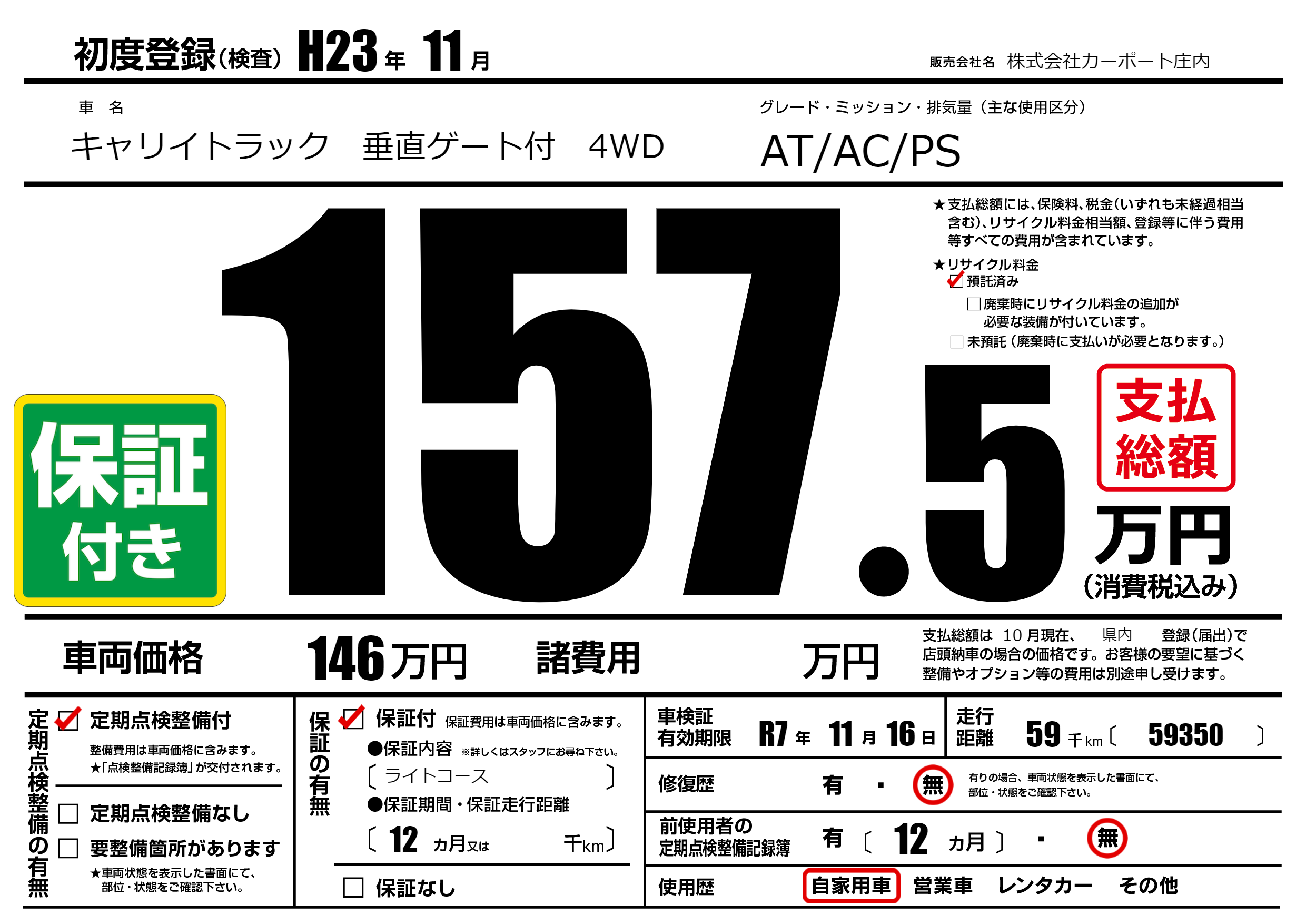 | 車名 | キャリイトラック 垂直ゲート付 4WD | グレード ミッション 排気量 |