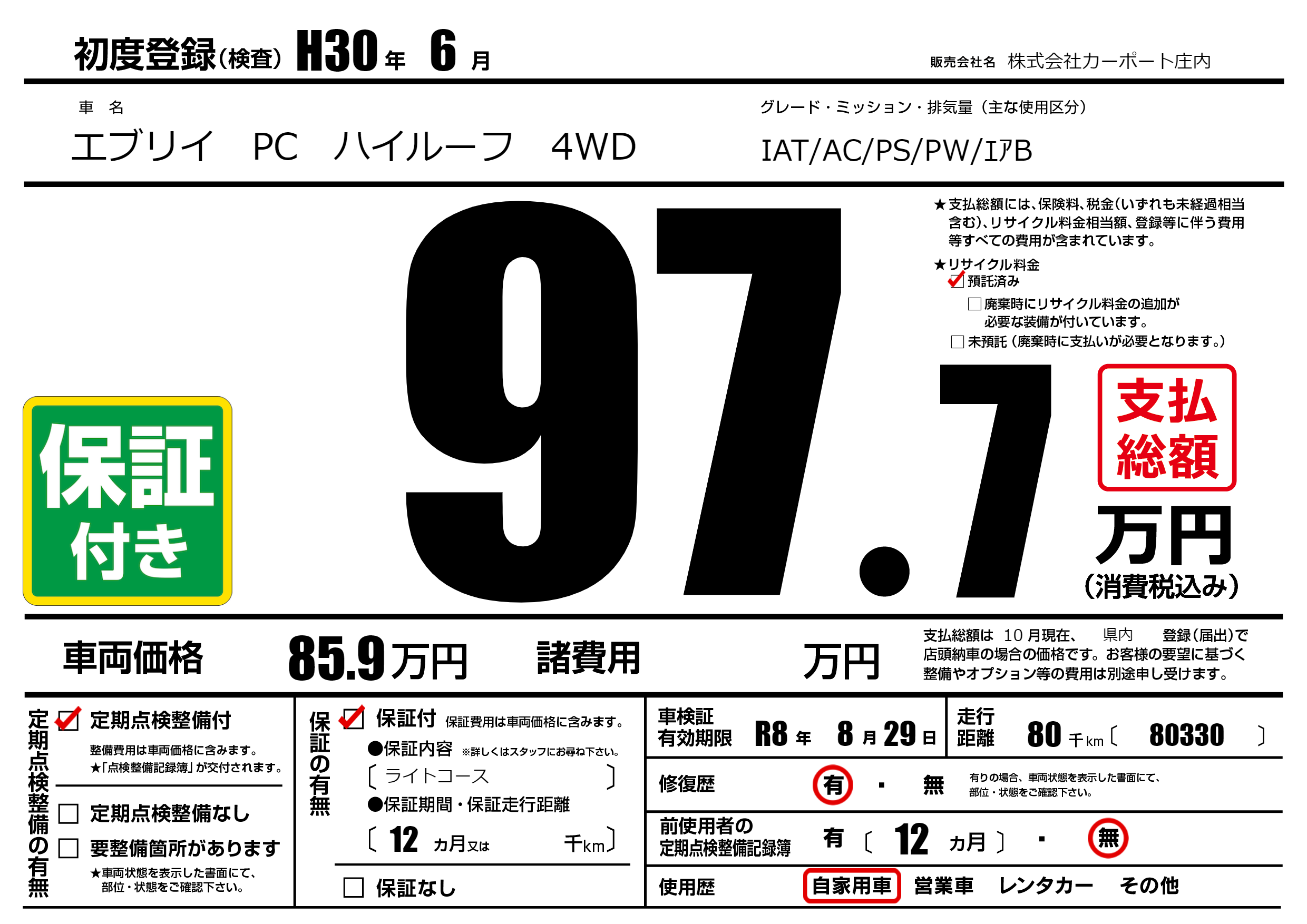 | 車名 | エブリイ PC ハイルーフ 4WD | グレード ミッション 排気量 |